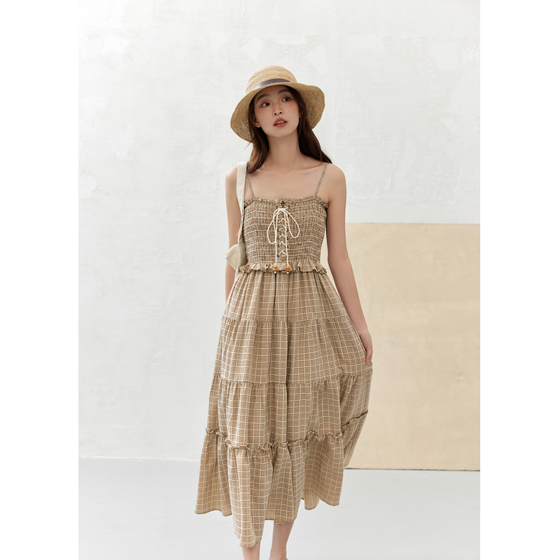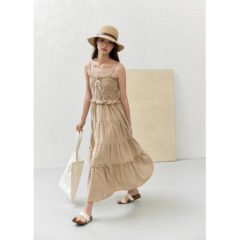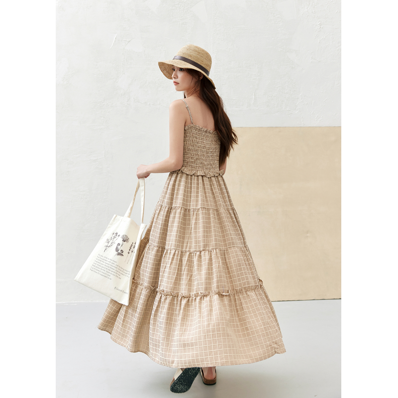 紫涵吊带格子连衣裙女2025年夏季 文艺复古松紧打揽高收腰长裙 新款