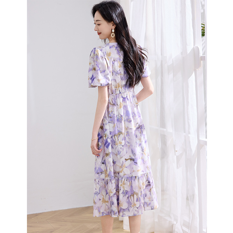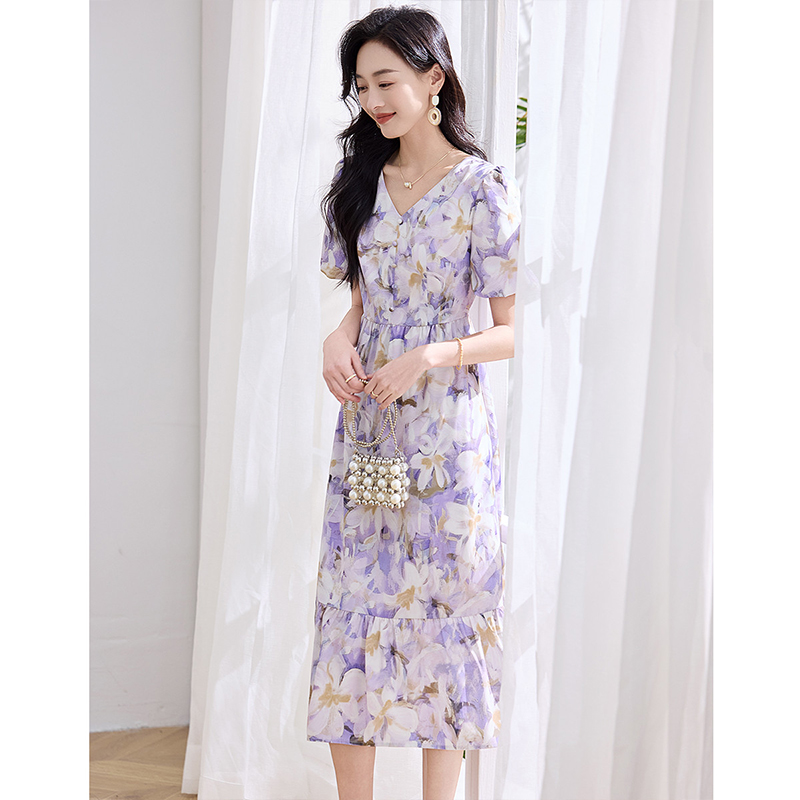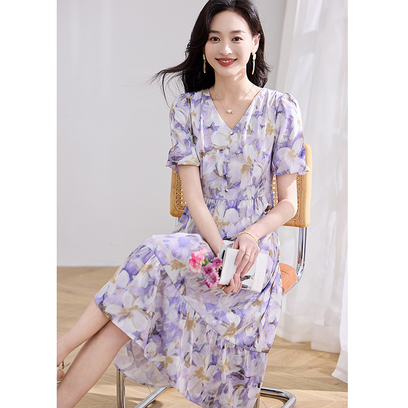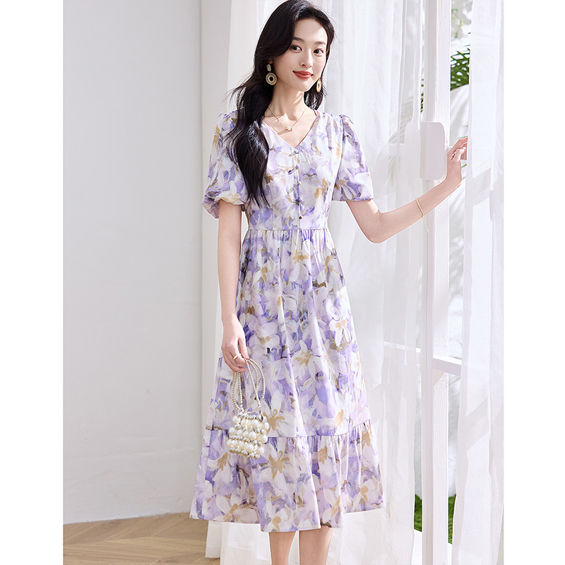 菲梦伊真丝印花连衣裙女夏装 高品质轻奢小众收腰V领超仙减龄长裙