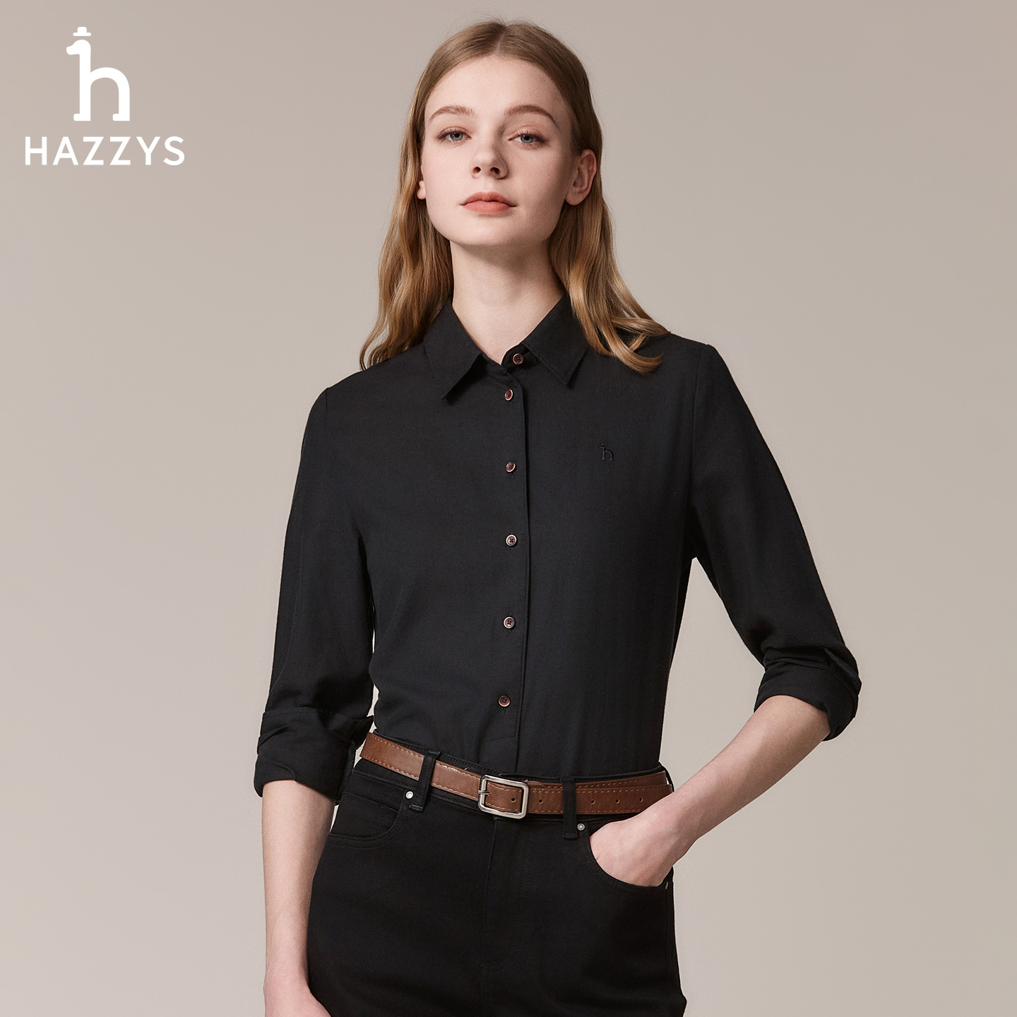 衬衣通勤上衣 女士秋冬时尚 Hazzys哈吉斯简约休闲素色磨毛长袖 衬衫