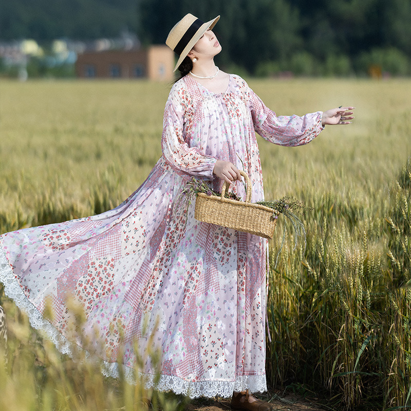 粉色印花连衣裙女2025薄款 夏季 V领宽松蕾丝花边大摆裙 慢生活