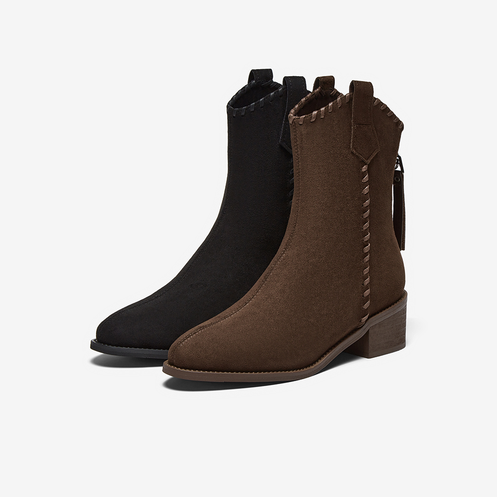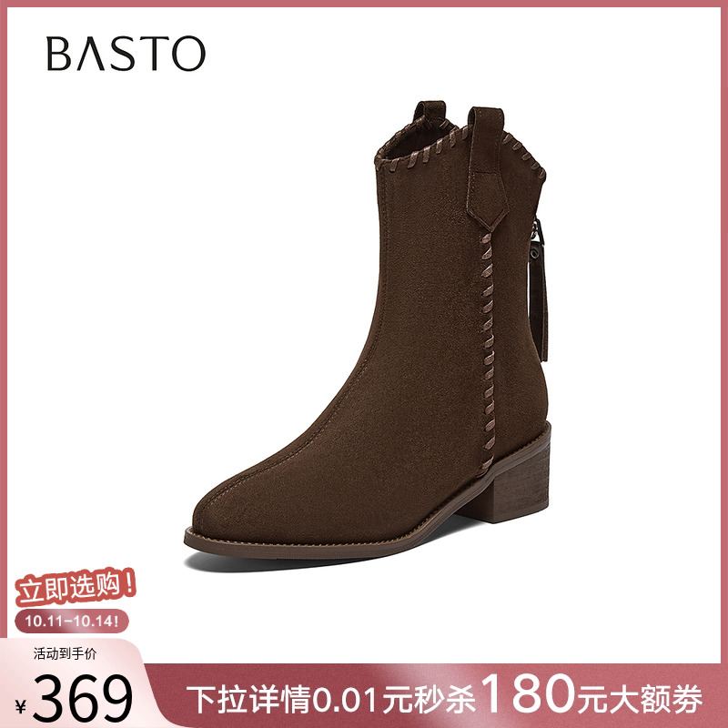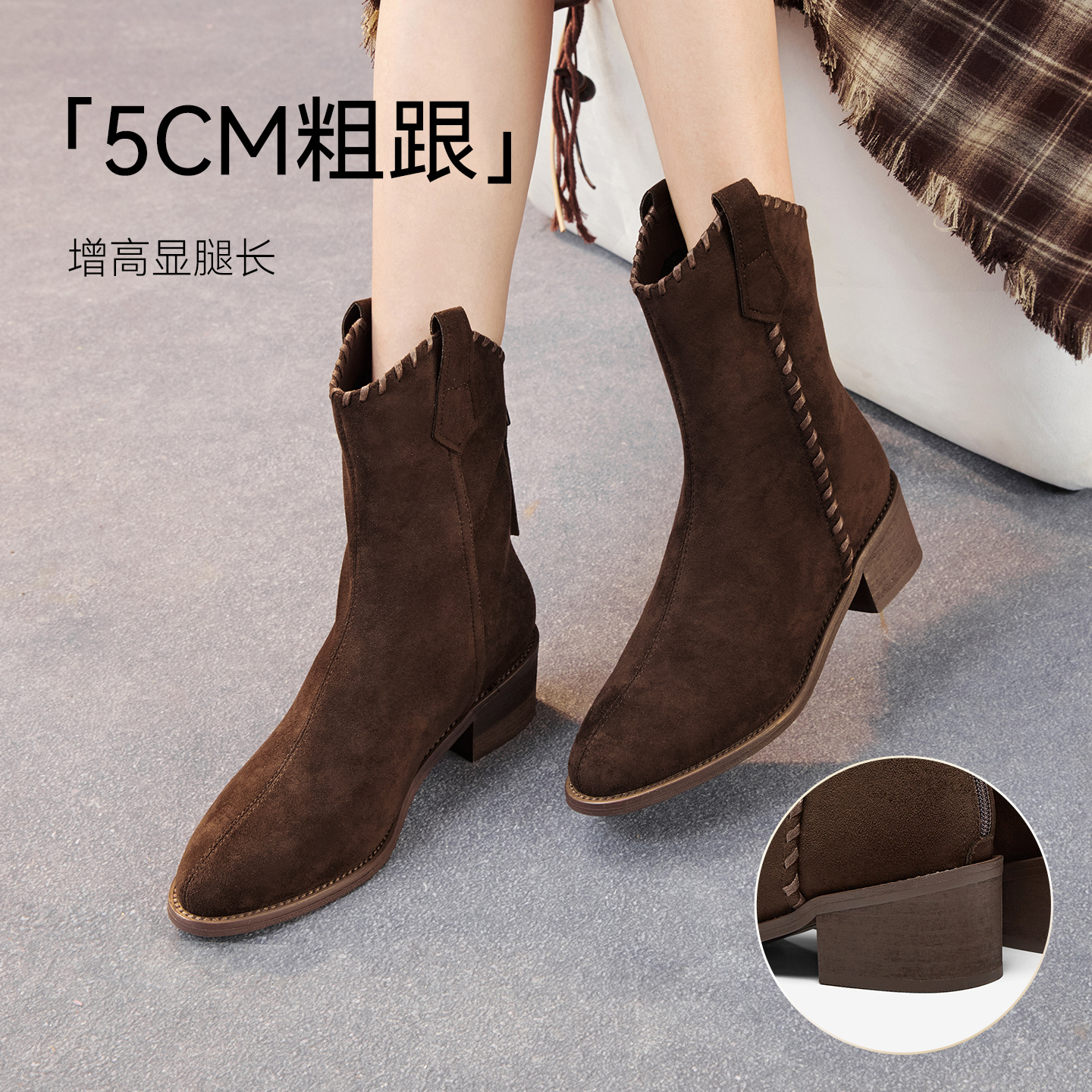 百思图2025冬季 V口绒面短靴粗跟女短筒骑士靴F3015DZ5 商场新款