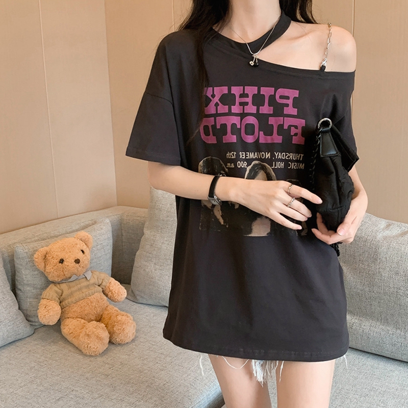 宽松小众设计感显瘦甜辣风半袖 T恤女夏季 上衣 露肩短袖 不规则美式