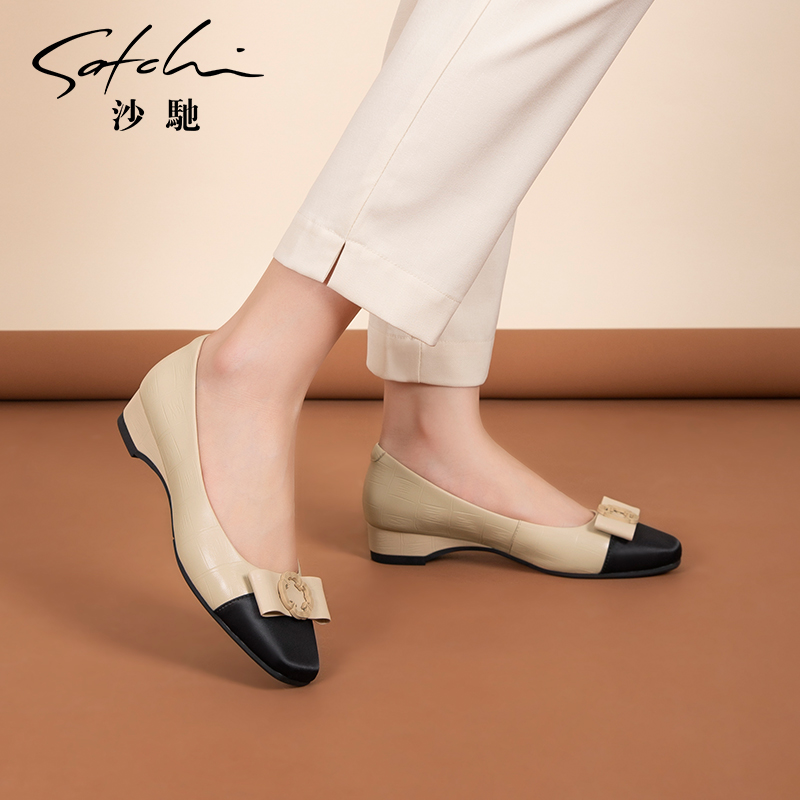 蝴蝶结低跟职业工作鞋 沙驰女鞋 新款 女春季 一脚蹬小坡跟单鞋