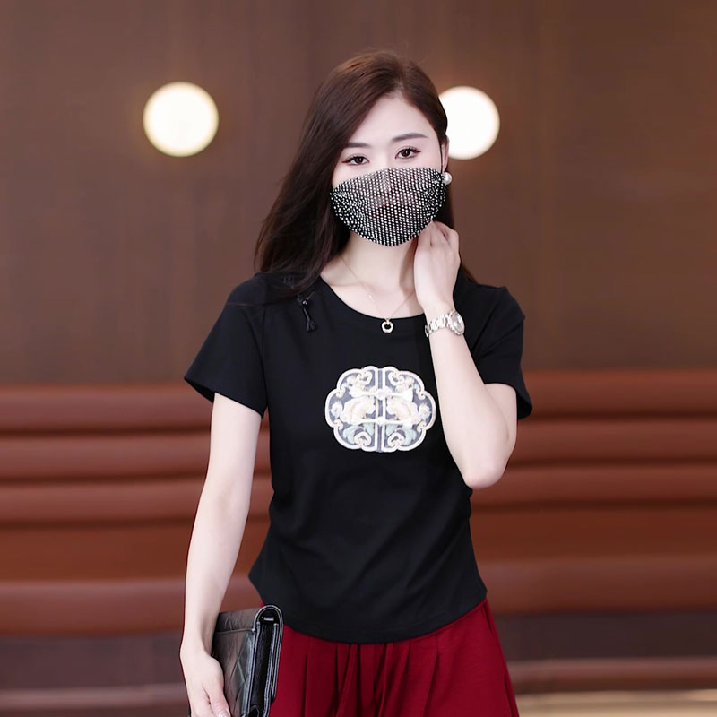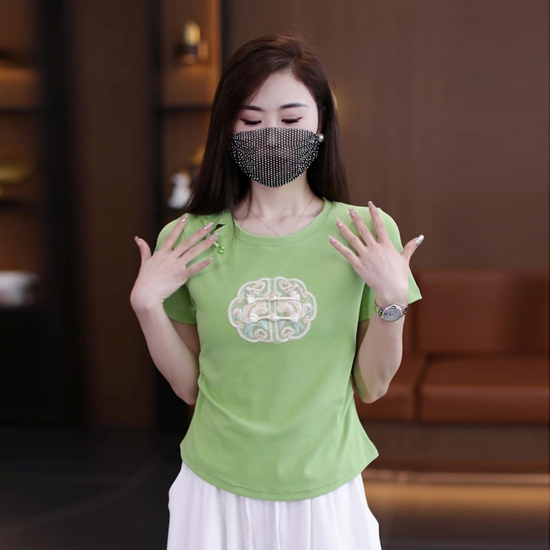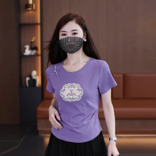 小个子短款 新中式 夏季 t恤2025新款 收腰刺绣紫色上衣 国风女士短袖