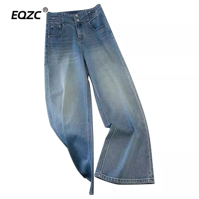 轻奢高腰显瘦休闲复古蓝色直筒裤 新款 女25年春秋季 做旧牛仔阔腿裤