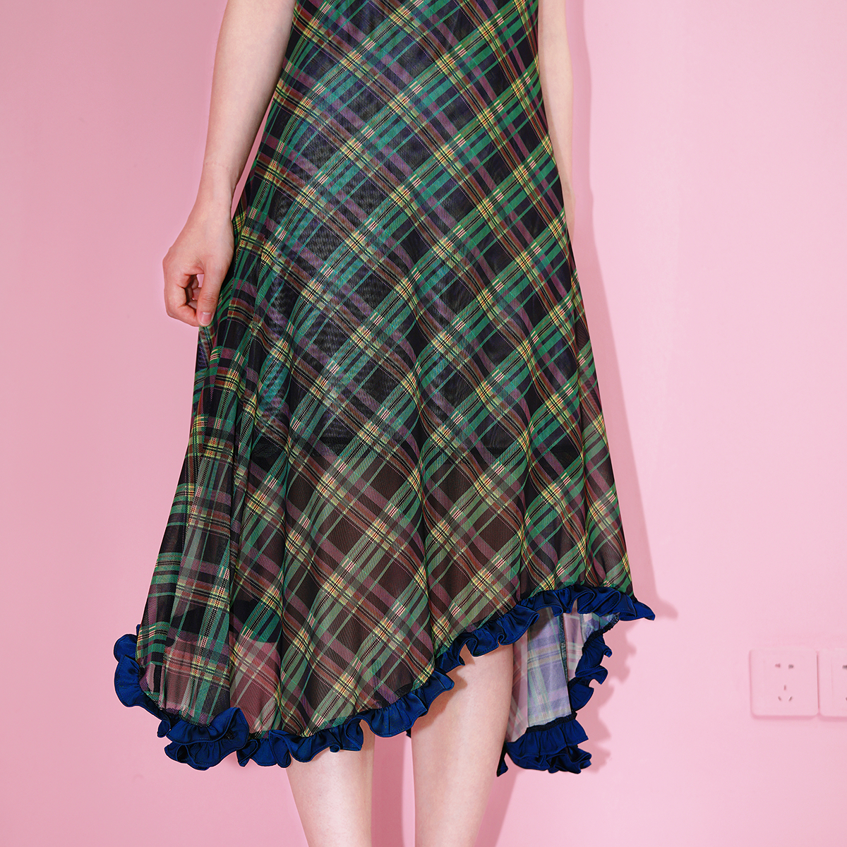 Juicy 格纹印花木耳花边中长吊带裙 Couture橘滋连衣裙女25夏新款