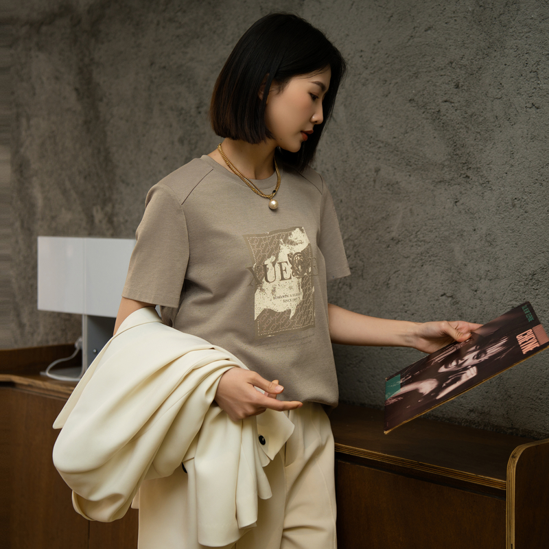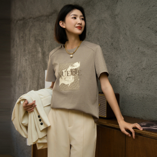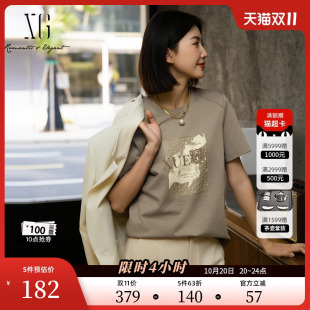 莱赛尔通勤圆领上衣女 新款 XG雪歌卡其色创意印花短袖 T恤2025秋季