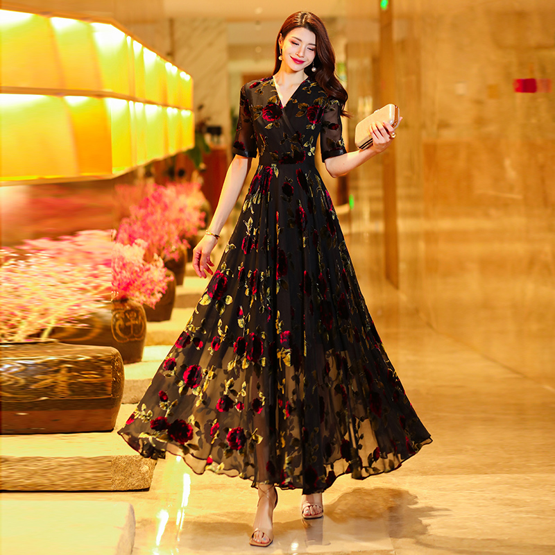 清仓捡漏黑色连衣裙女高端收腰显瘦高级感夏气质超长裙到脚踝1776