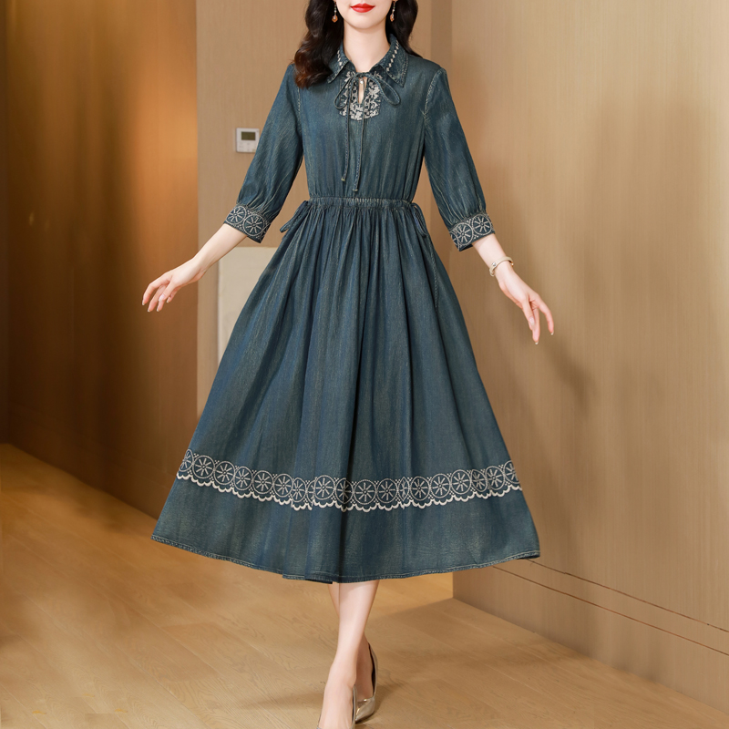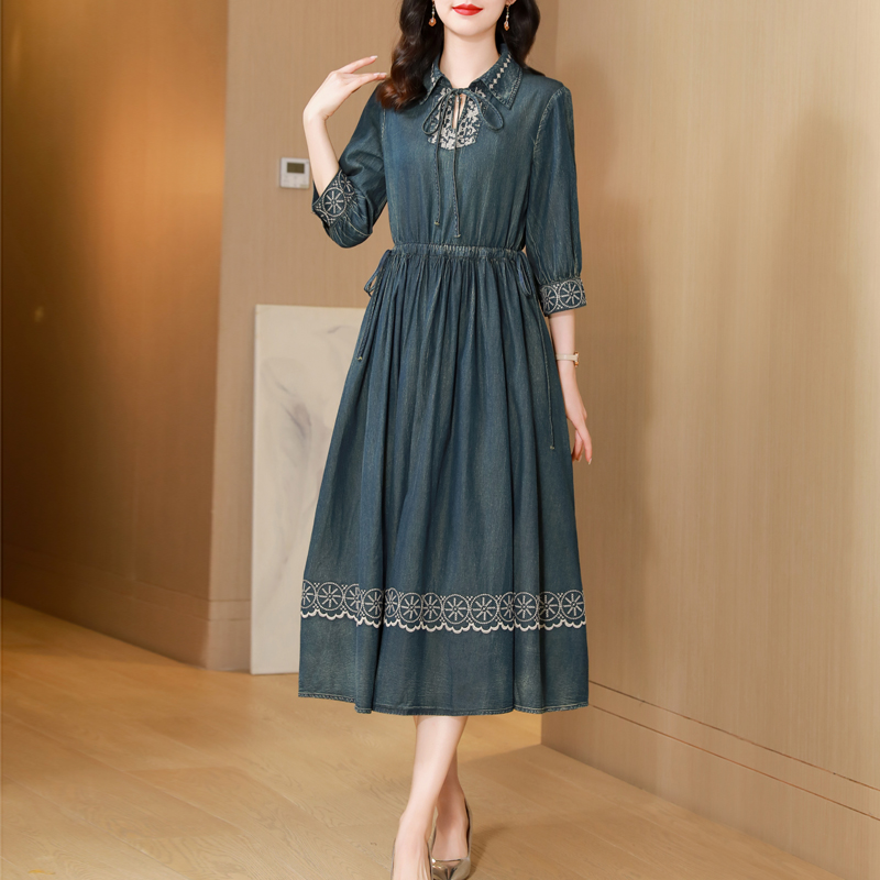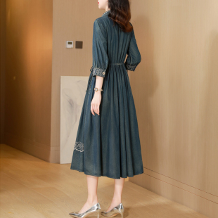 2024春秋新款 长裙 复古重工刺绣牛仔连衣裙女收腰显瘦气质A字长款