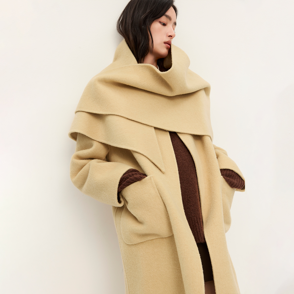 POPCHRIO欧可芮 羊毛外套女 驼绒大翻领双面毛呢呢子大衣中长短款