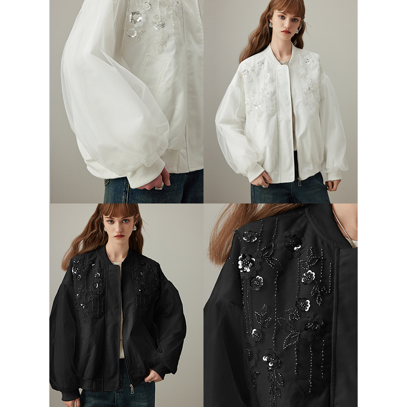 重工亮片短款 新款 夹克外套 网纱拼接棒球服女2025秋季 dfvc黑色时尚