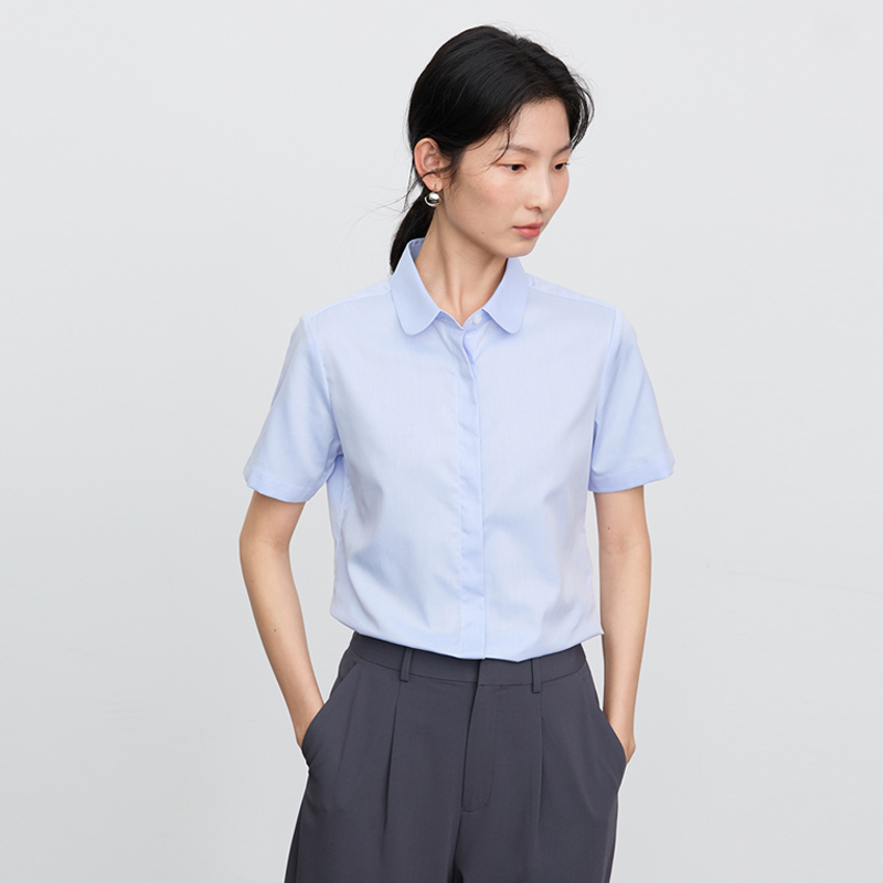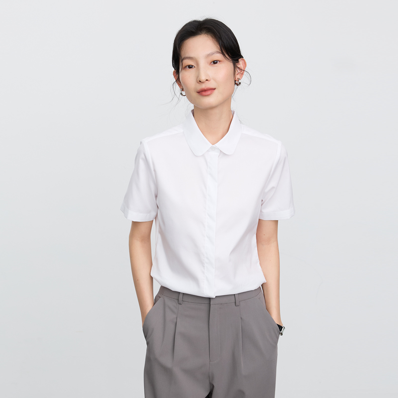新款 女2025夏季 娃娃领职业通勤上衣考公面试棉衬衣 衬衫 宿·色短袖