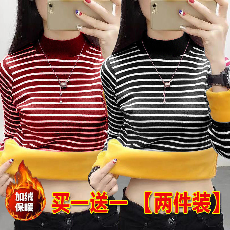 半高领条纹长袖 秋冬季 女宽松大码 加绒加厚保暖内搭打底衫 T恤 新款