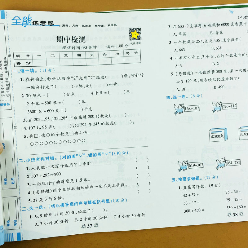 三年级上册数学试卷人教版 测试周考月考重点难点期中期末复习试卷全真模拟试卷综合训练荣恒 同步测试卷视频讲解三年级上册同步单元