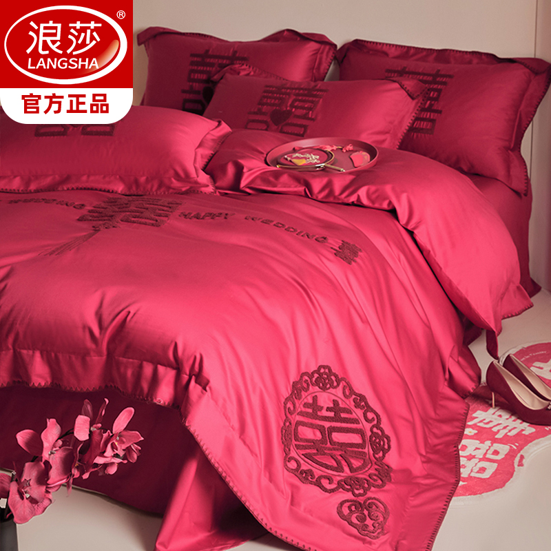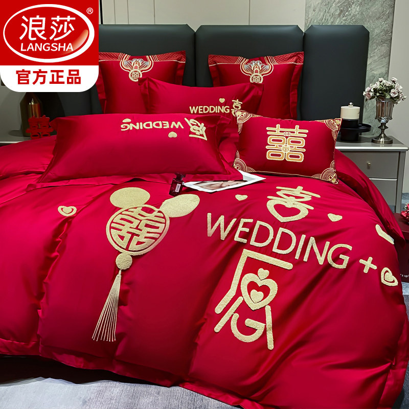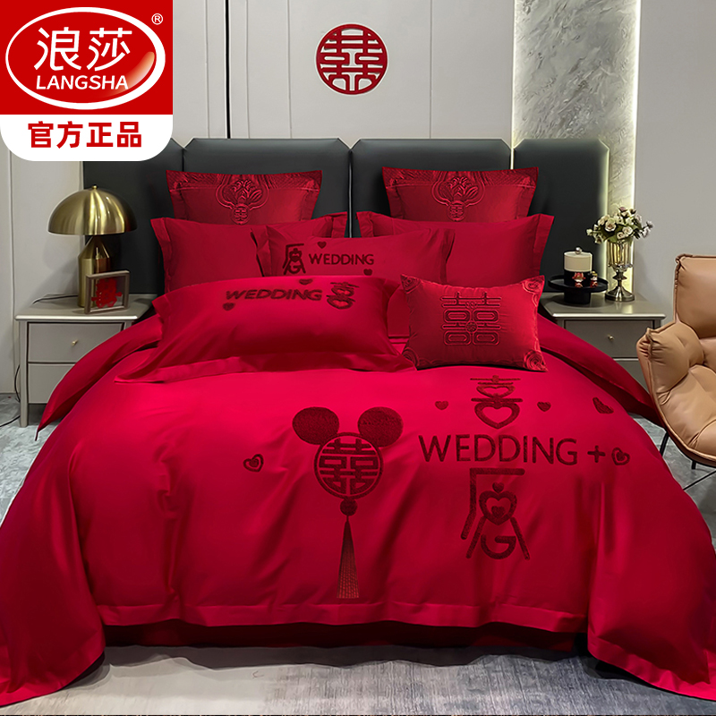 水星家纺100S长绒棉婚庆四件套红色全棉结婚套件婚房喜庆轻奢床品