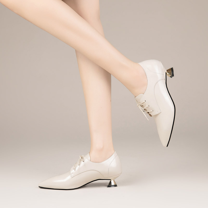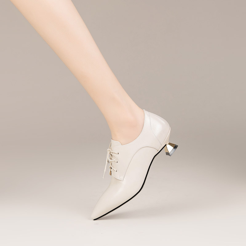 低跟深口鞋 真皮尖头米白色系带单鞋 中跟女鞋 四季 子 2025春季 鞋 新款