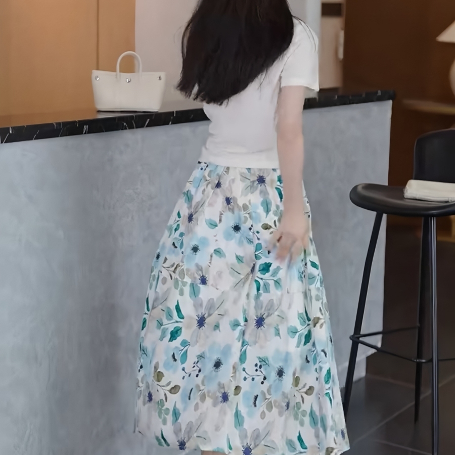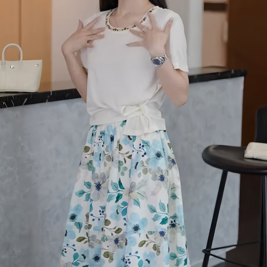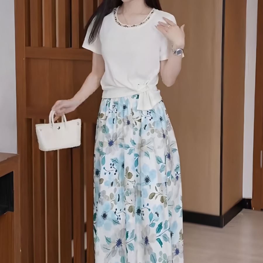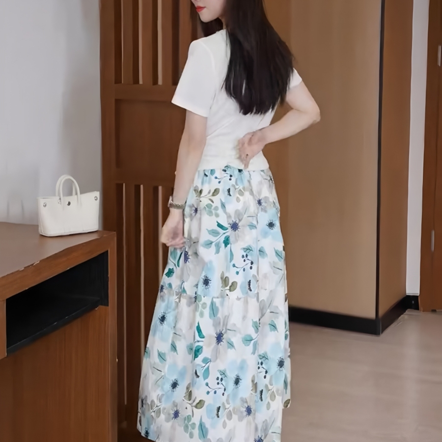 洋气减龄冰丝短袖 时尚 新款 裙女夏季 t恤上衣碎花半身裙两件套 套装