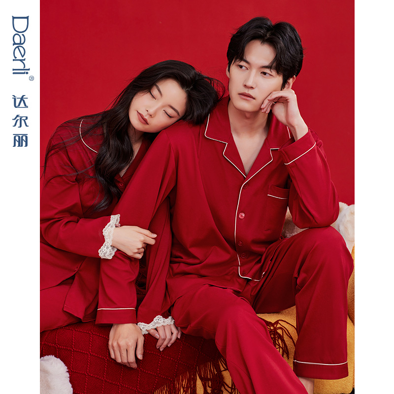 纯色款 套装 情侣翻领纯棉家居服男士 达尔丽红色本命年睡衣女春秋季