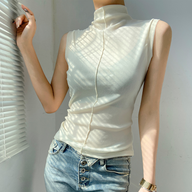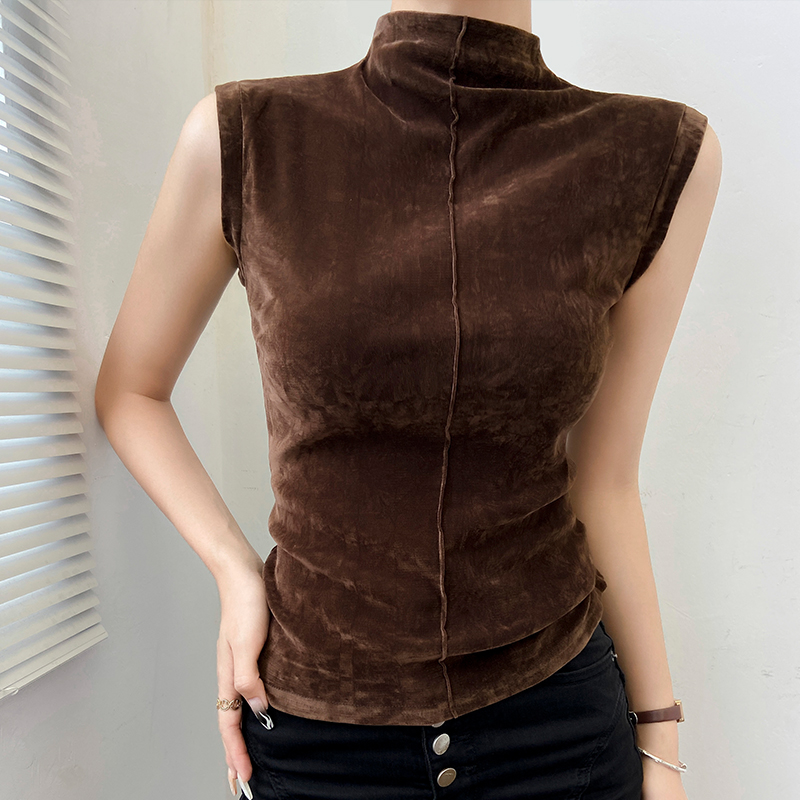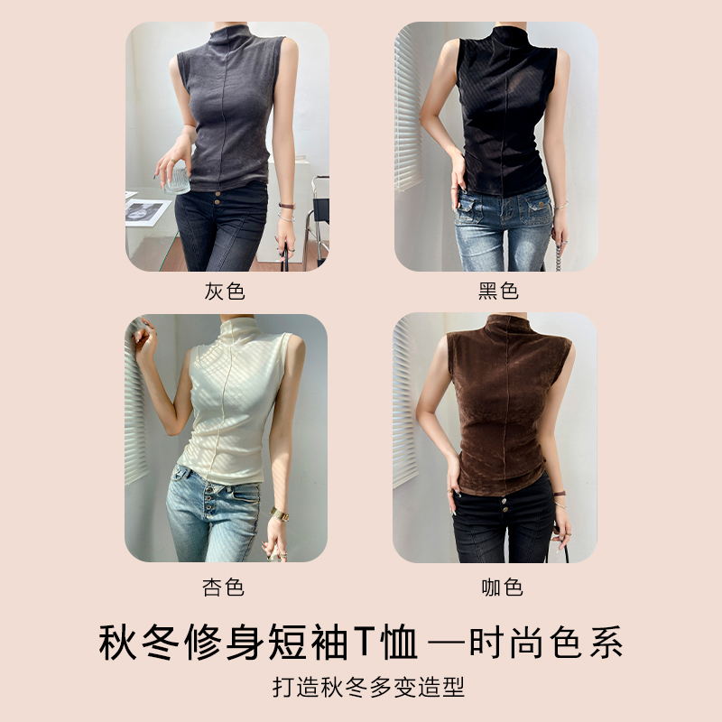t恤薄 早秋背心高级感上衣半高领无袖 黑色金丝绒打底衫 女2025新款