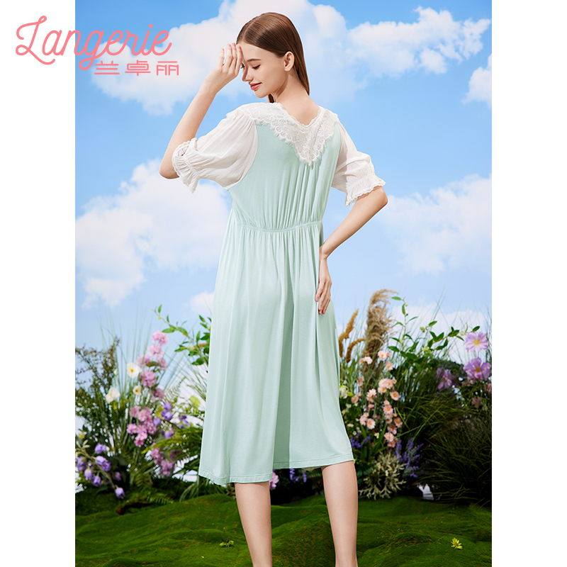 款 兰卓丽睡裙女短袖 V领睡衣宽松舒适家居服遮点防走光2025年夏季