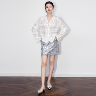 新款 女冬季 肌理暗纹刺绣宽松休闲内搭上衣 衬衫 紫涵莱赛尔翻领长袖