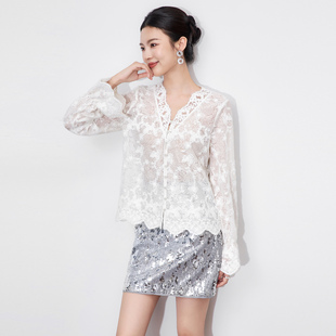 新款 女春秋季 甜美学院风内搭胸花衬衣潮 衬衫 紫涵蕾丝边娃娃领长袖