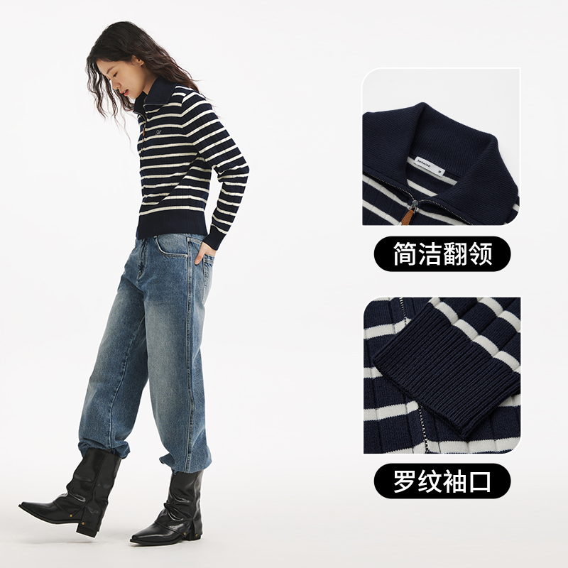 经典 女士翻领松弛感学院风条纹POLO开衫 简约 新款 热风2025年秋季