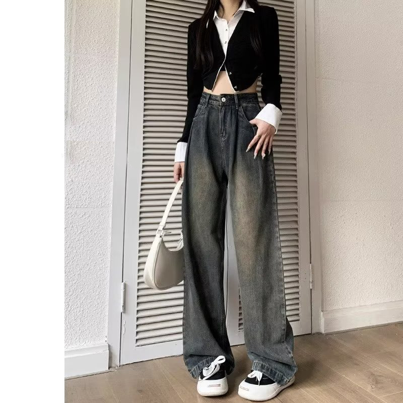 高腰宽松显瘦拖地直筒裤 复古垂感阔腿牛仔裤 美式 新款 子 女2025秋季