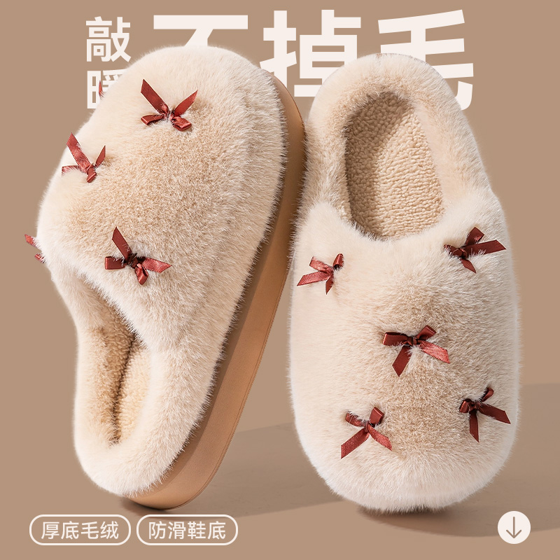 可爱蝴蝶结室内家居厚底包头拖鞋 毛绒保暖防滑月子鞋 女冬季 棉拖鞋