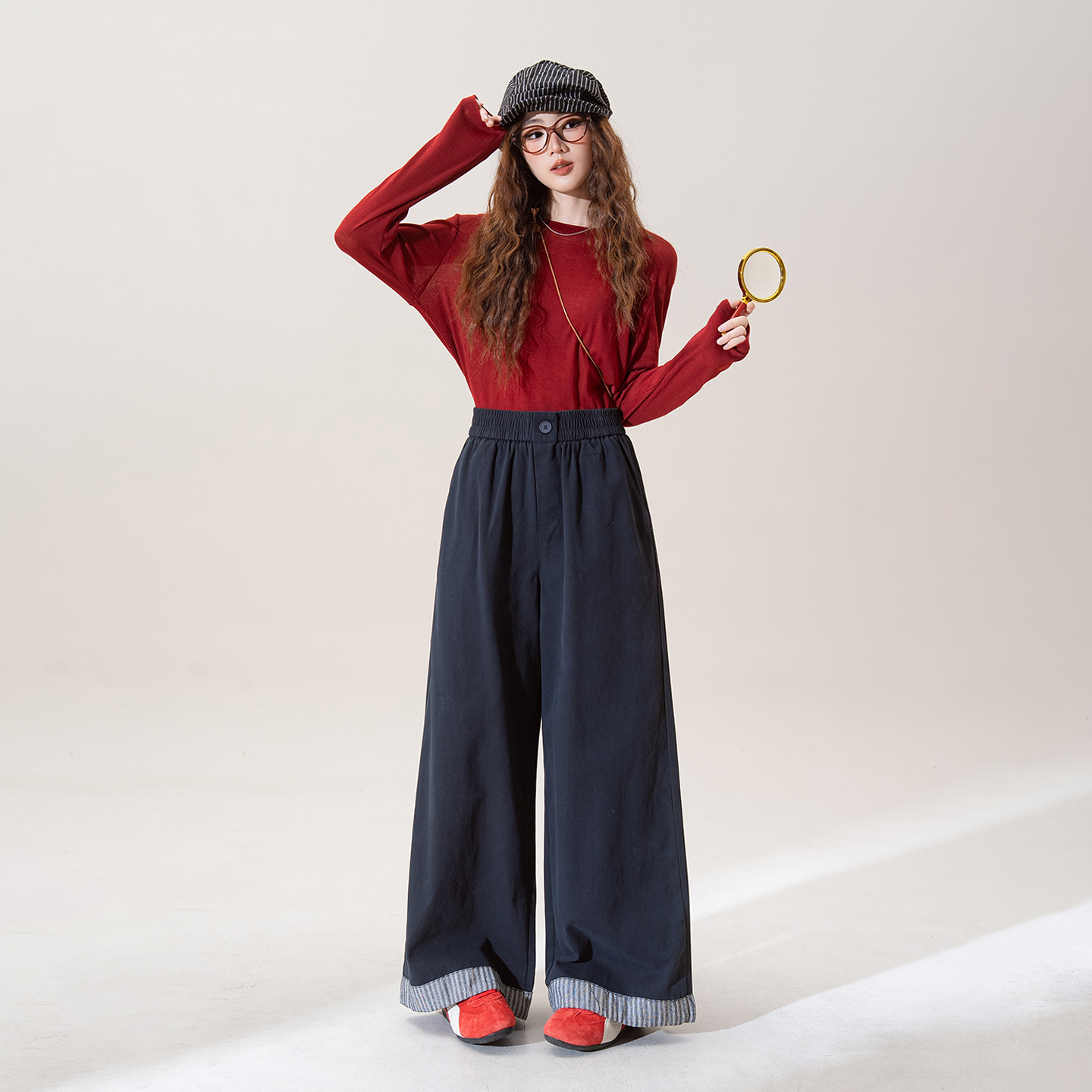 高腰宽松百搭直筒休闲裤 新款 女秋季 藏青色日系慵懒条纹卷边阔腿裤