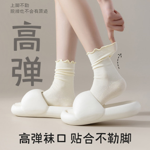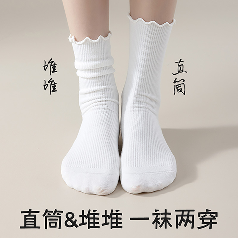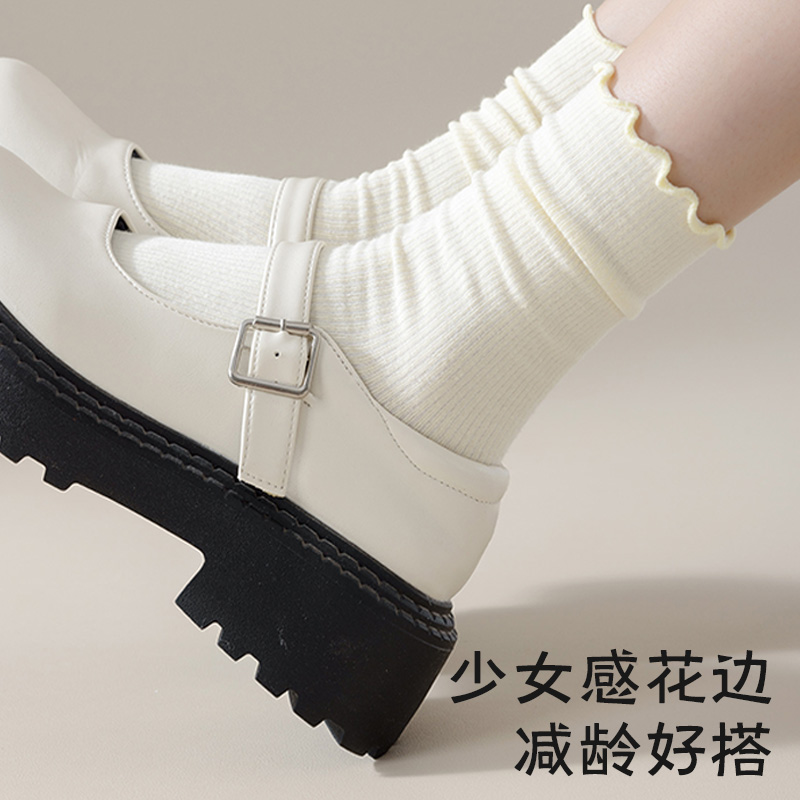 配小皮鞋 纯色中筒袜花边纯棉无骨月子袜白色长筒袜 堆堆袜子女秋季