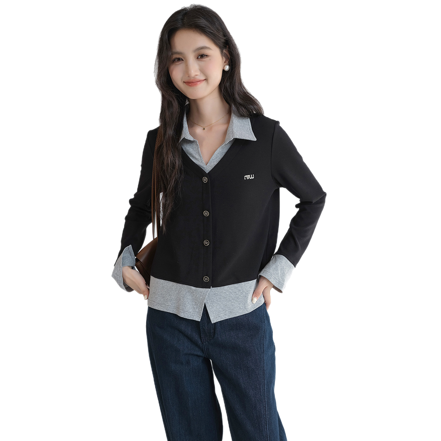 假两件Polo领针织衫 修身 蓝若水大码 新款 内搭拼接上衣 2025秋装