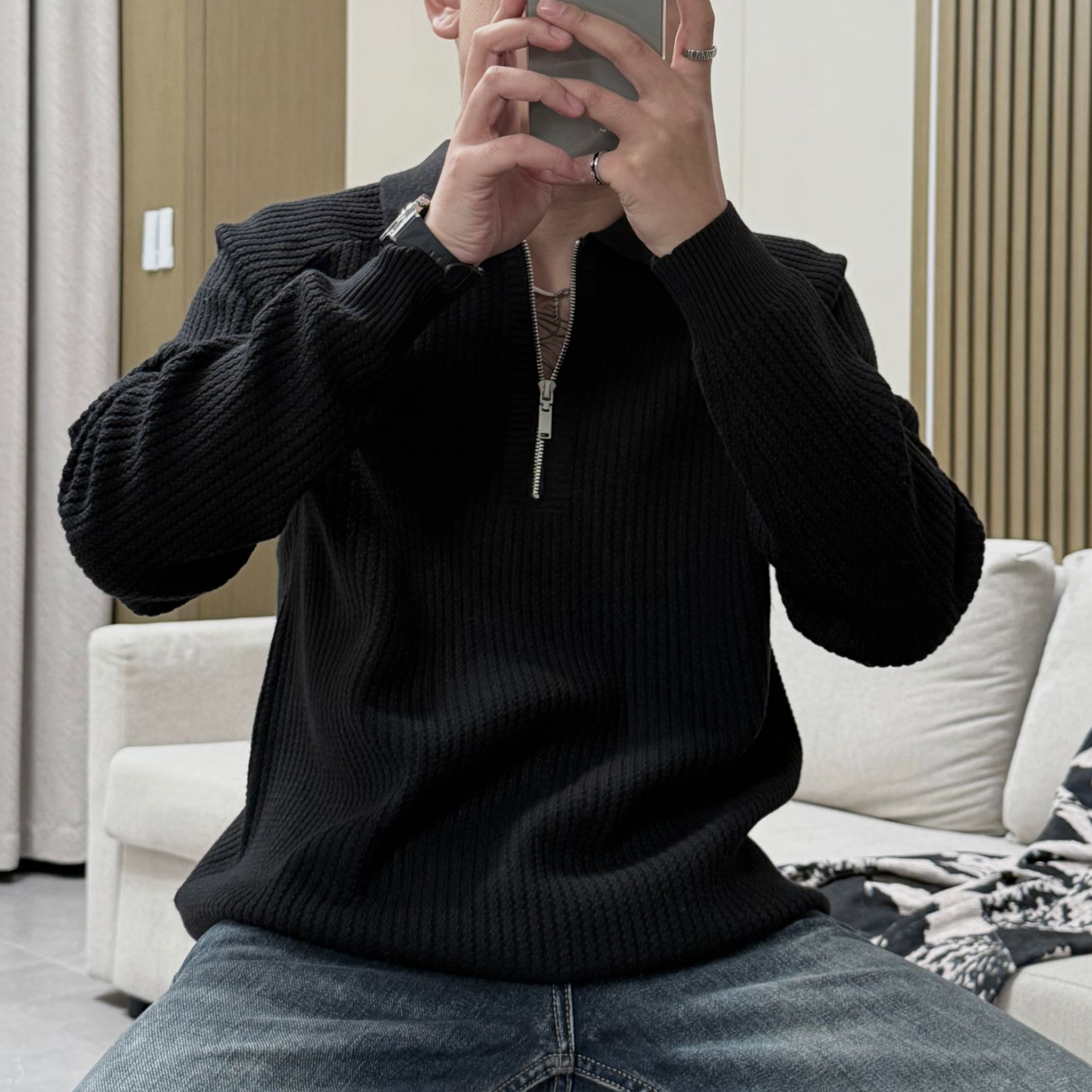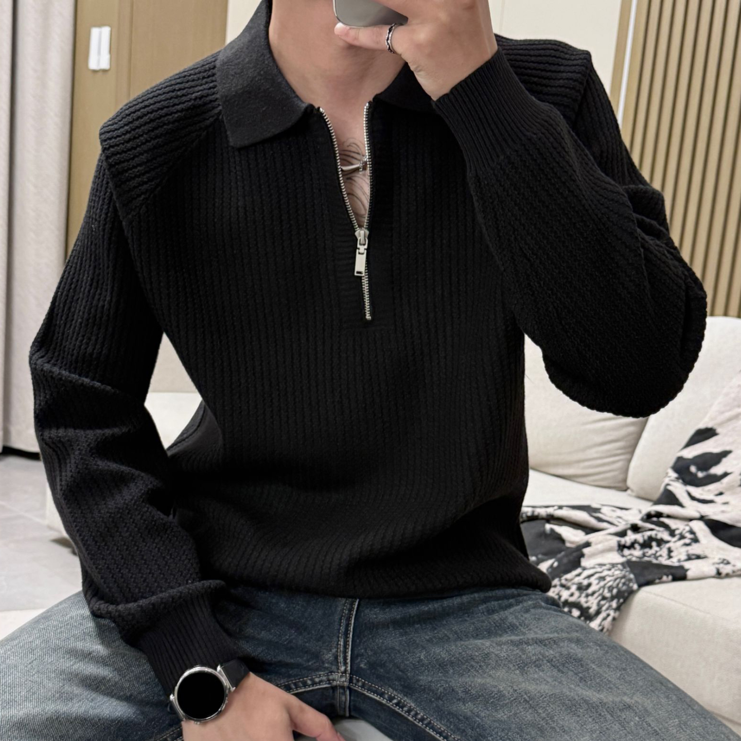新黑色厚款 25秋季 双领毛衣男 海澜之家轻商务加绒假两件针织衫 HLA