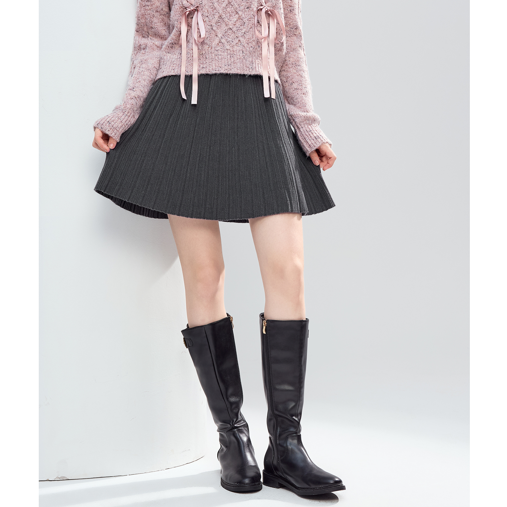 图曼朵灰色毛呢百褶半身裙女高腰加厚a字裙秋冬通勤面试中长半裙