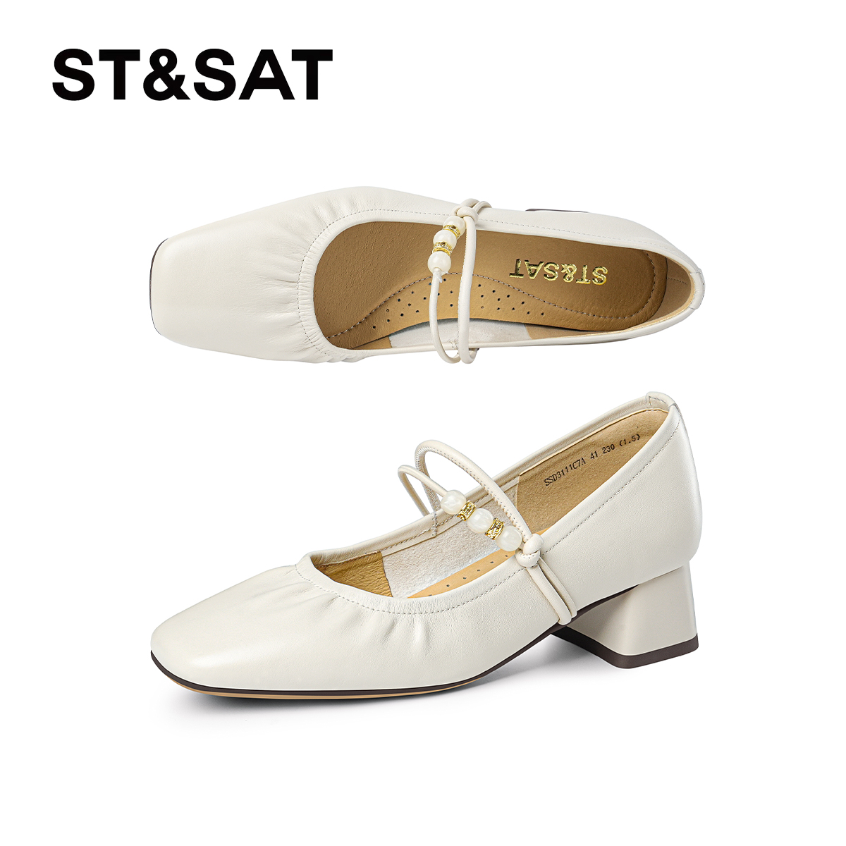 真皮浅口单鞋 新款 子E1T1DCQ5预 女2025秋季 百丽复古粗高跟玛丽珍鞋