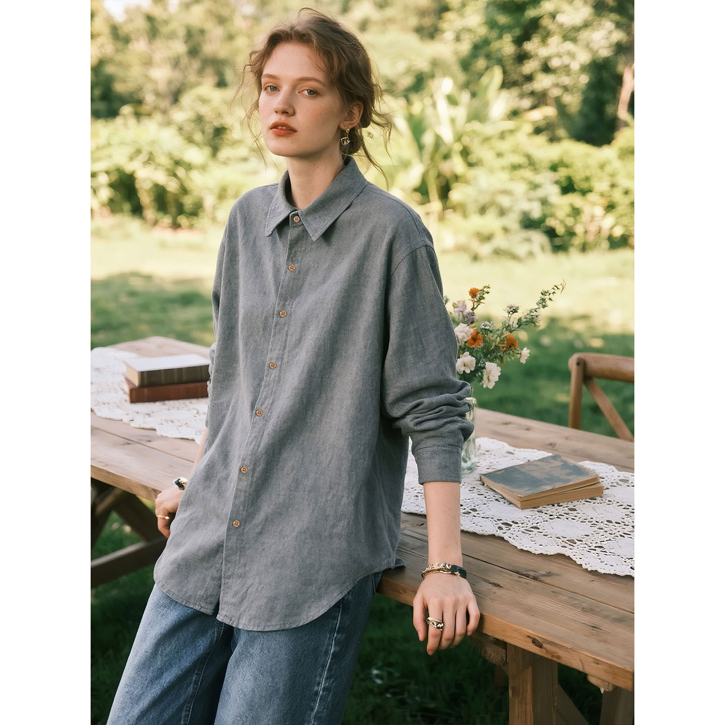 气质休闲衬衣显瘦 韩版 复古蓝格纹100%棉衬衫 女MOFAN摩凡2025秋款