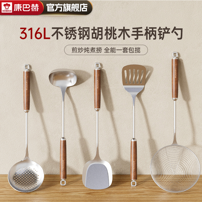 康巴赫锅铲316L不锈钢胡桃木铲子家用厨具炒菜勺套装 全套铲勺漏勺