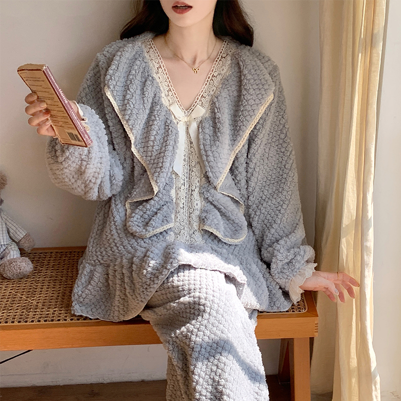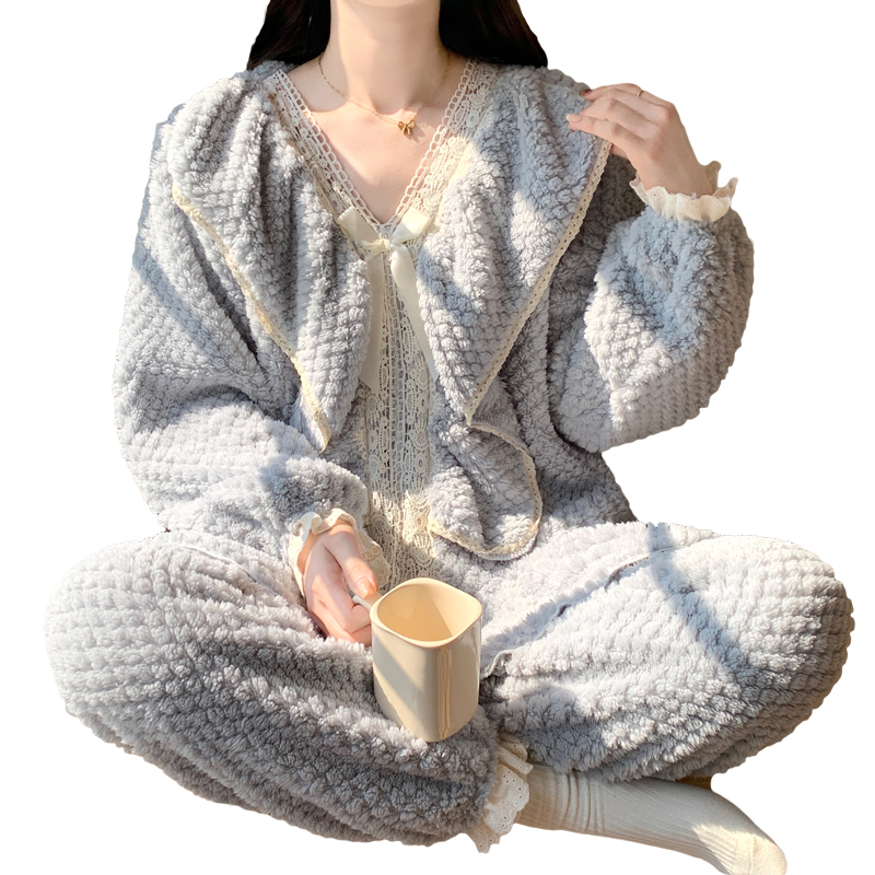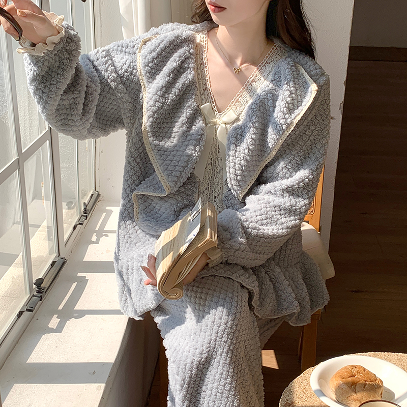 可外穿珊瑚绒家居服女抗静电冬季 红豆居家女士羊羔绒睡衣套装 开衫