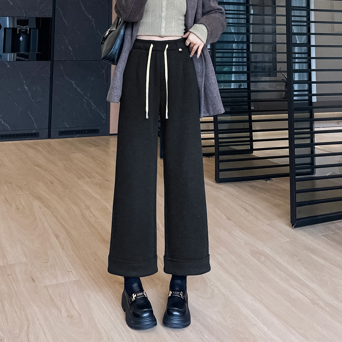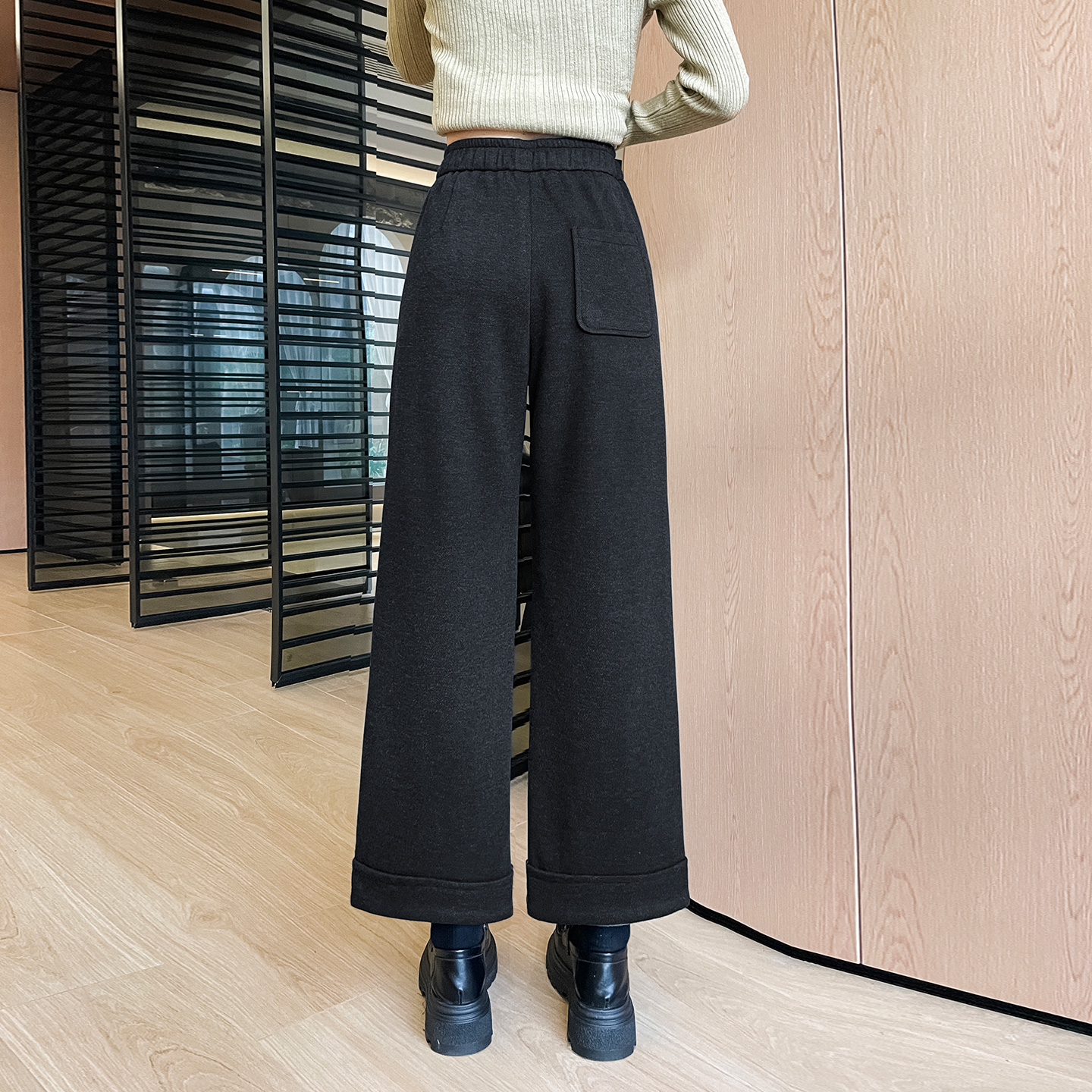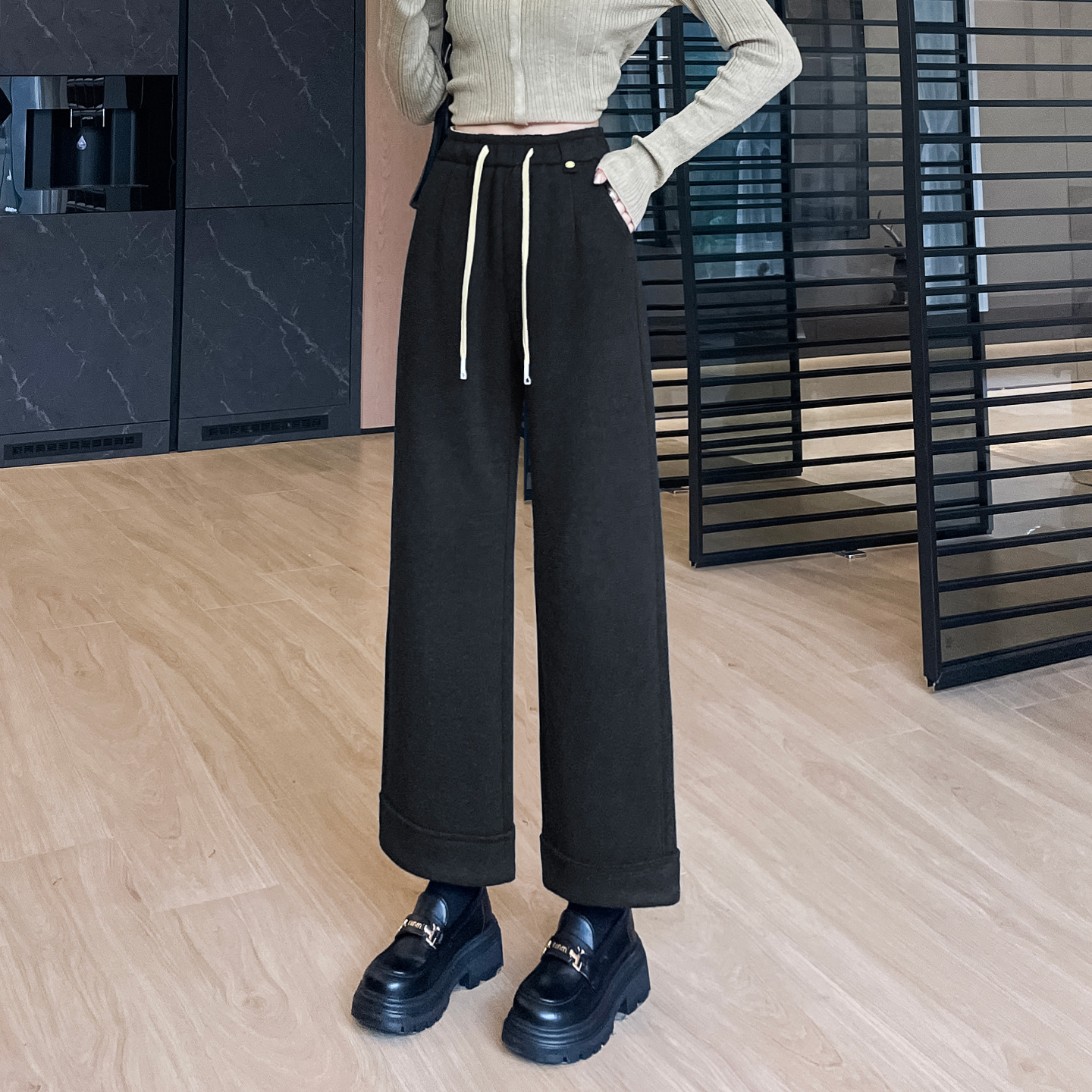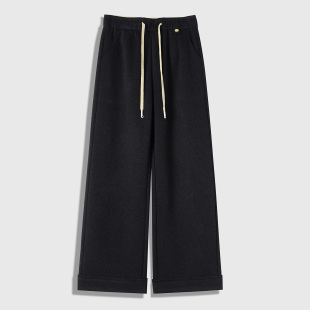 直筒裤 绵羊毛松紧高腰卷边九分小众窄版 女秋冬新款 黑色毛呢阔腿裤