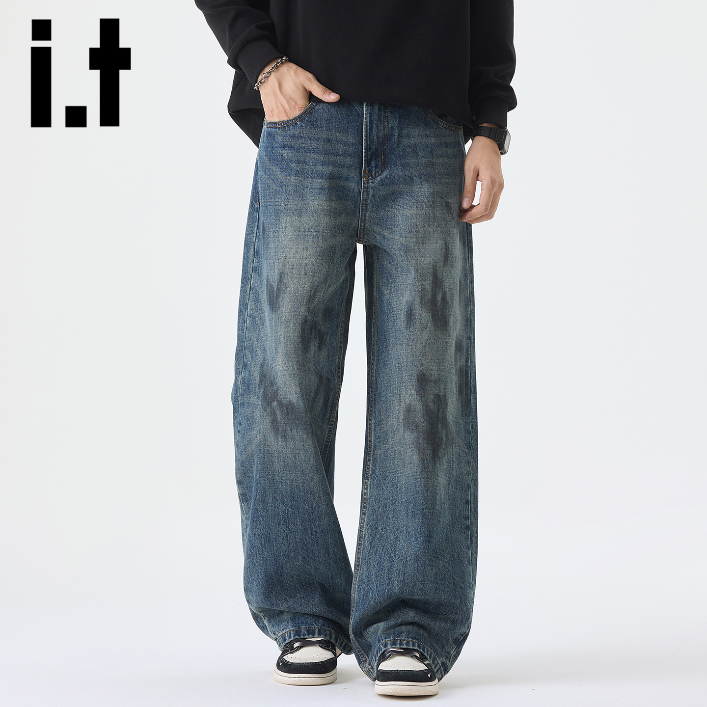 高街复古cleanfit痞帅微喇阔腿裤 春秋潮牌美式 男款 马克华菲牛仔裤