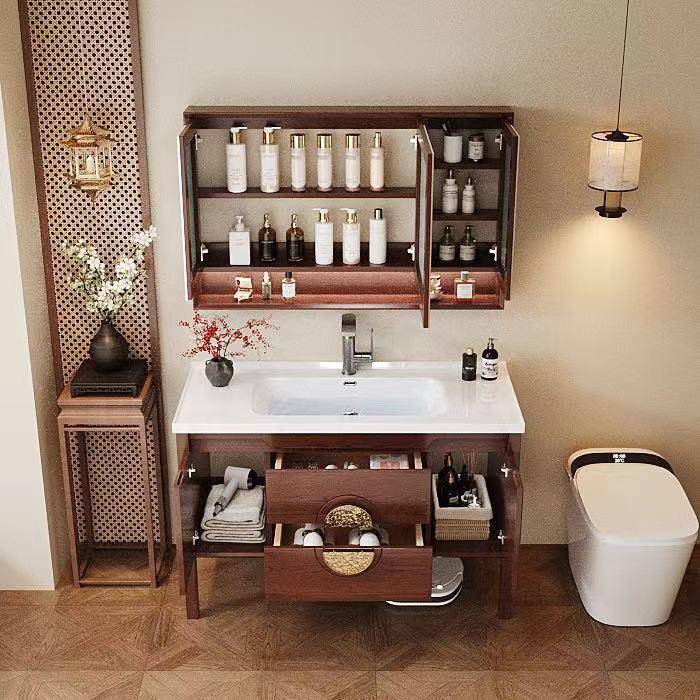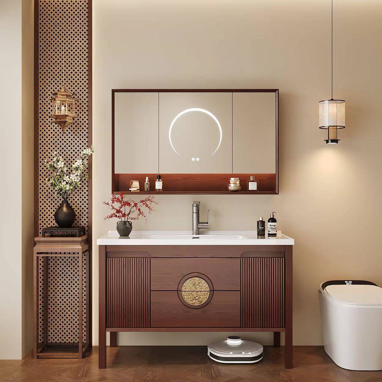 乌金木双盆洗手盆柜组合 落地式 中式 橡木浴室柜陶瓷一体盆2025新款