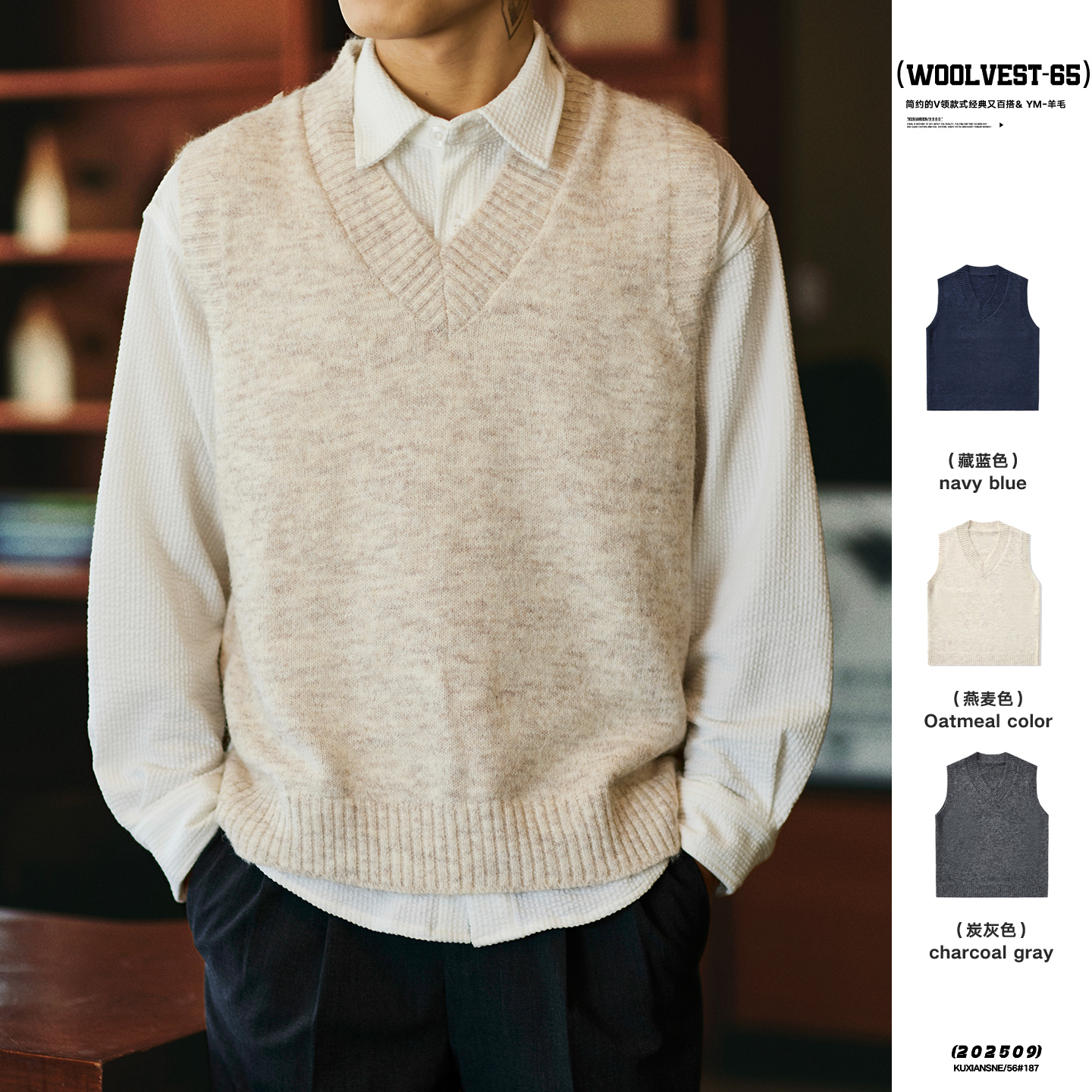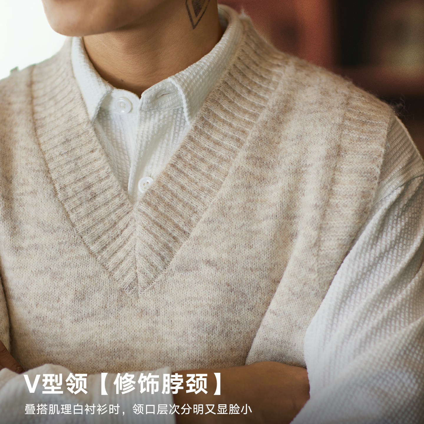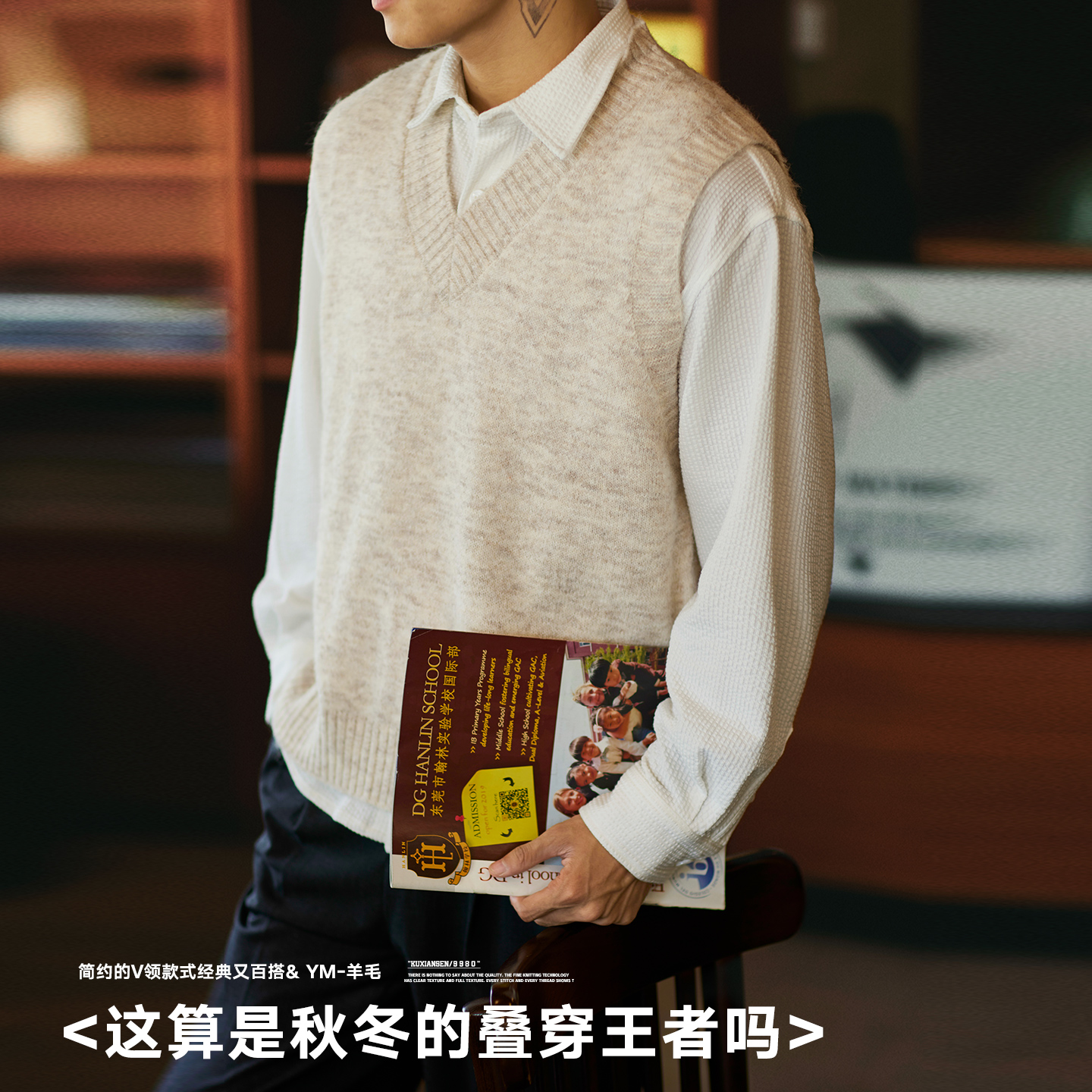 保暖打底马甲上衣 针织毛衣男V领宽松美式 宇透春秋季 羊毛混纺无袖