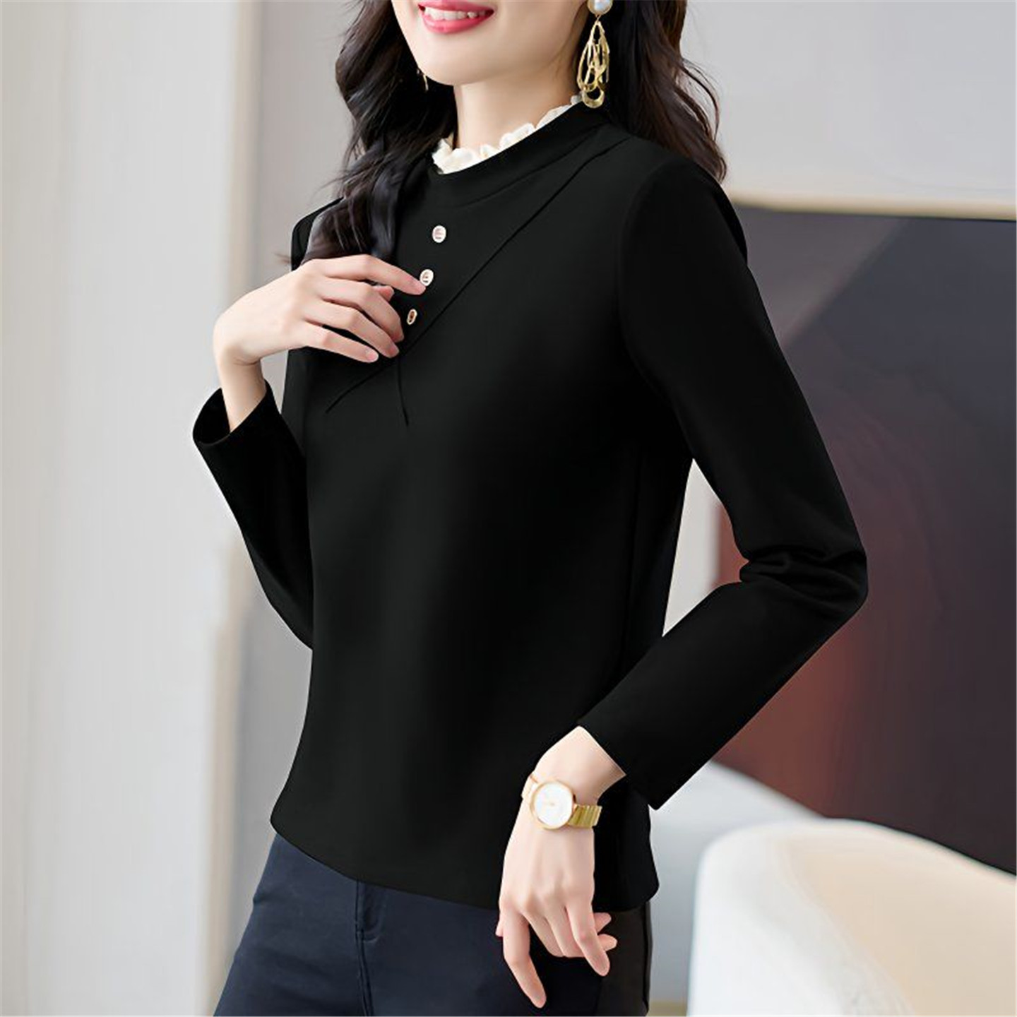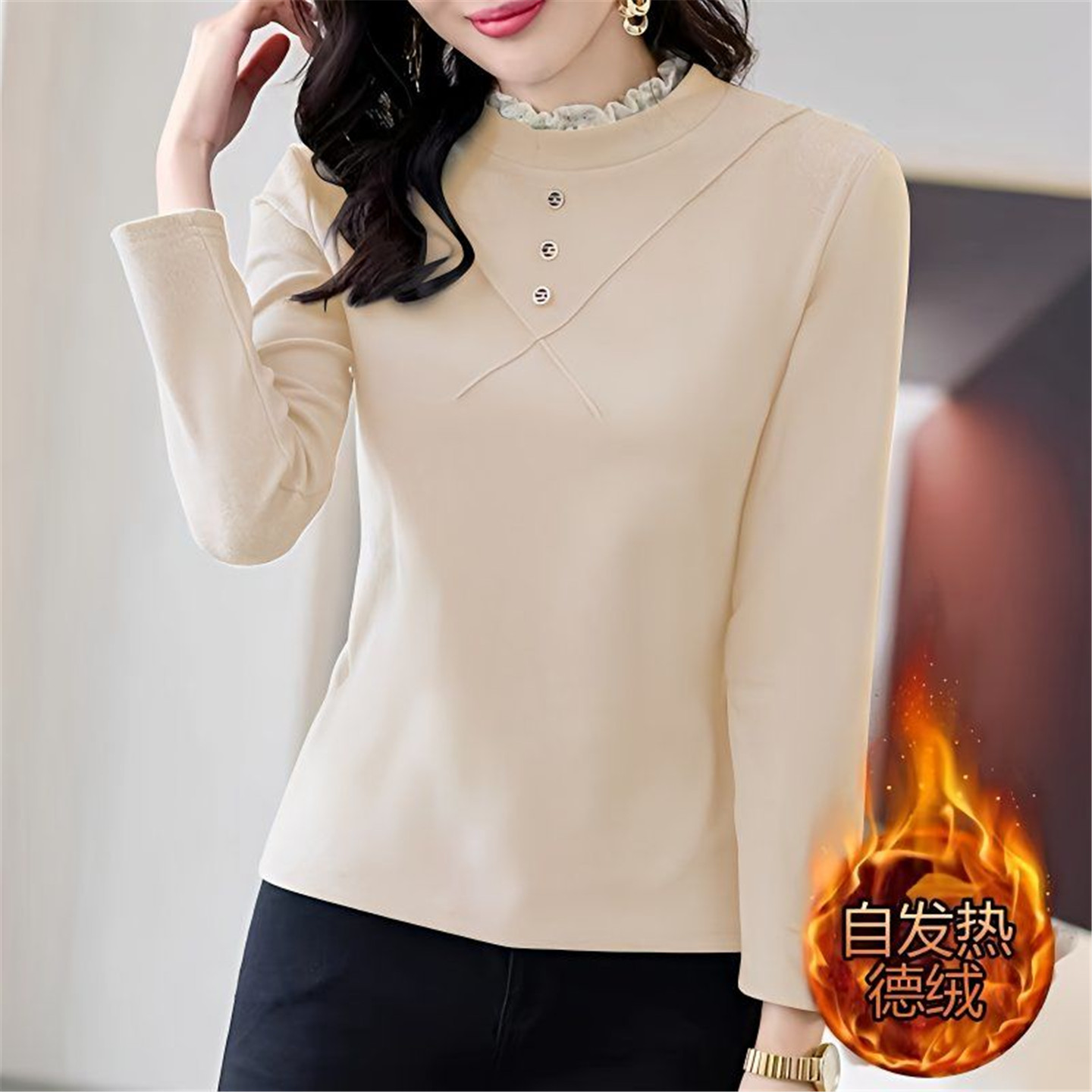 蕾丝花边长袖 时尚 t恤保暖上衣 女士秋冬新款 半高领双面德绒打底衫