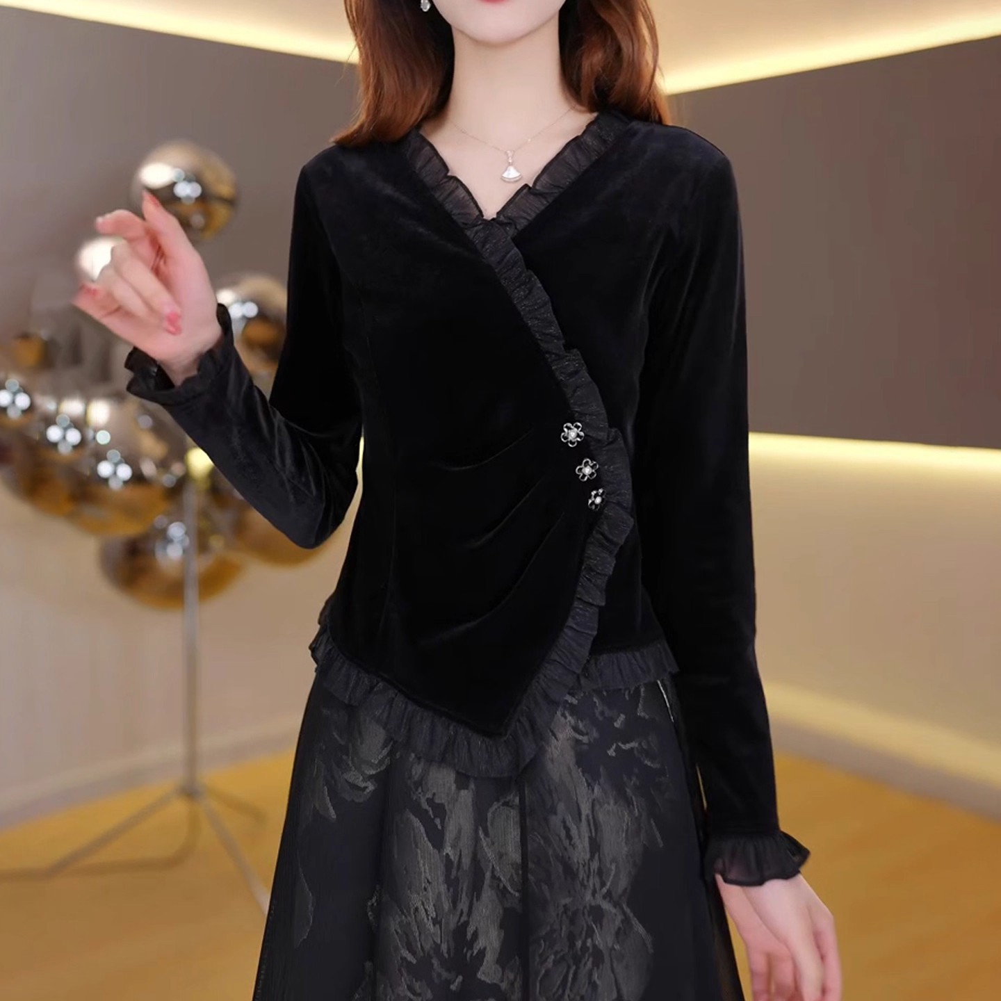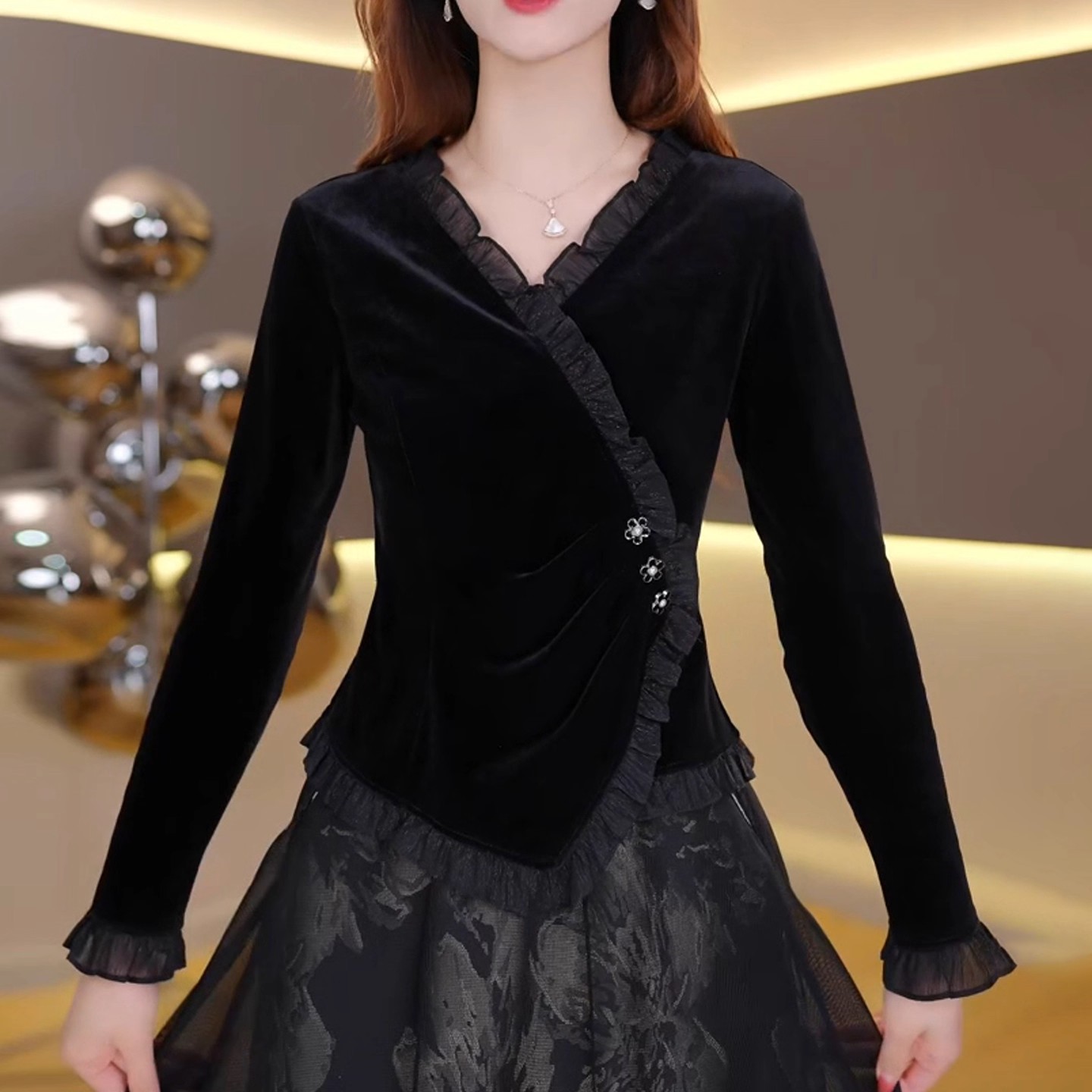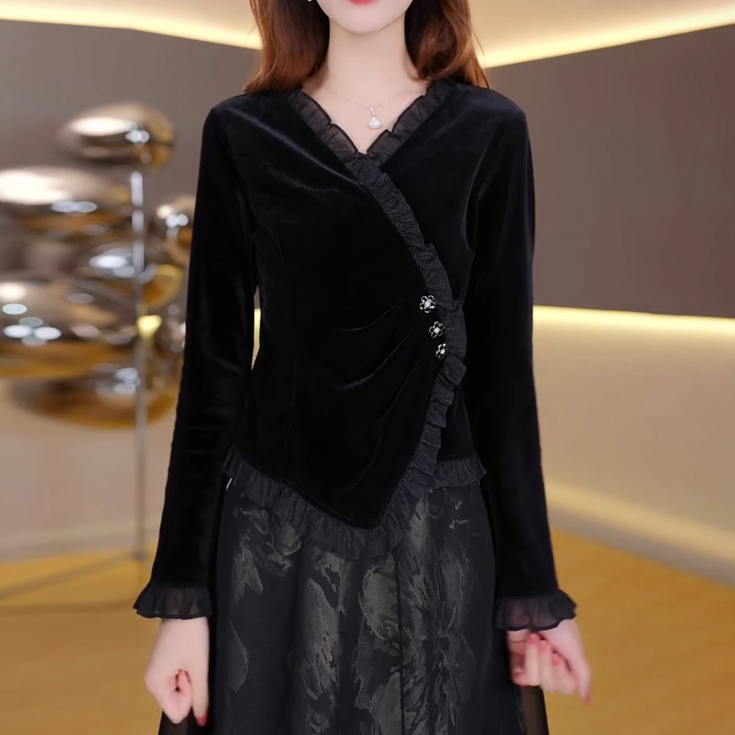 衬衫 黑色丝绒v领长袖 女春秋胖mm收腰遮肚不规则欧货上衣 法式 大码