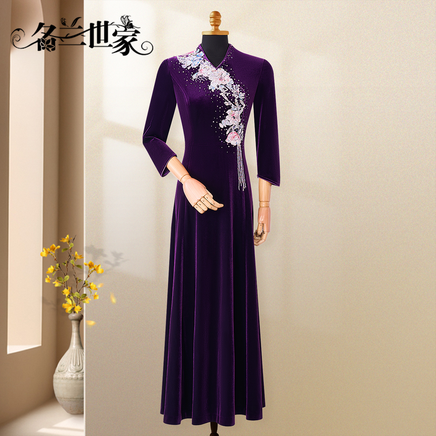 夏 改良旗袍模特走秀团队演出服宴会晚装 紫缘萱中国风长款 礼服中式