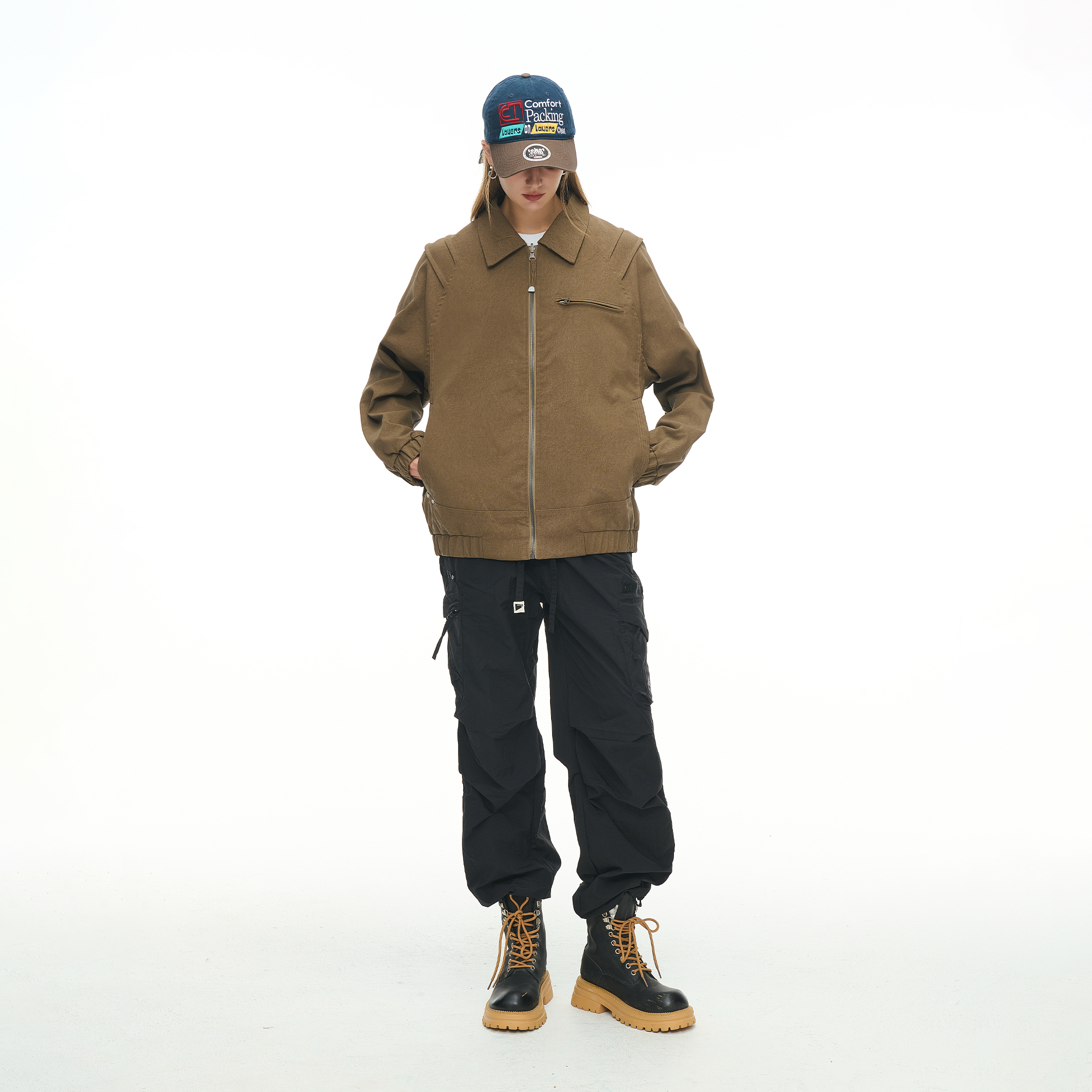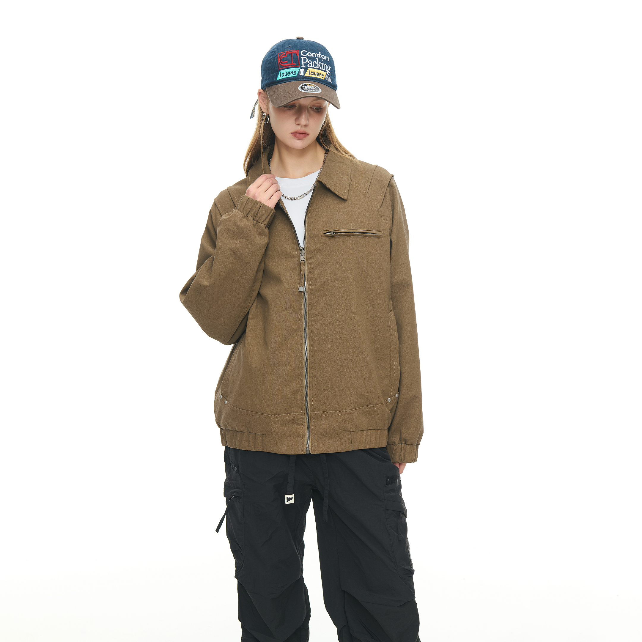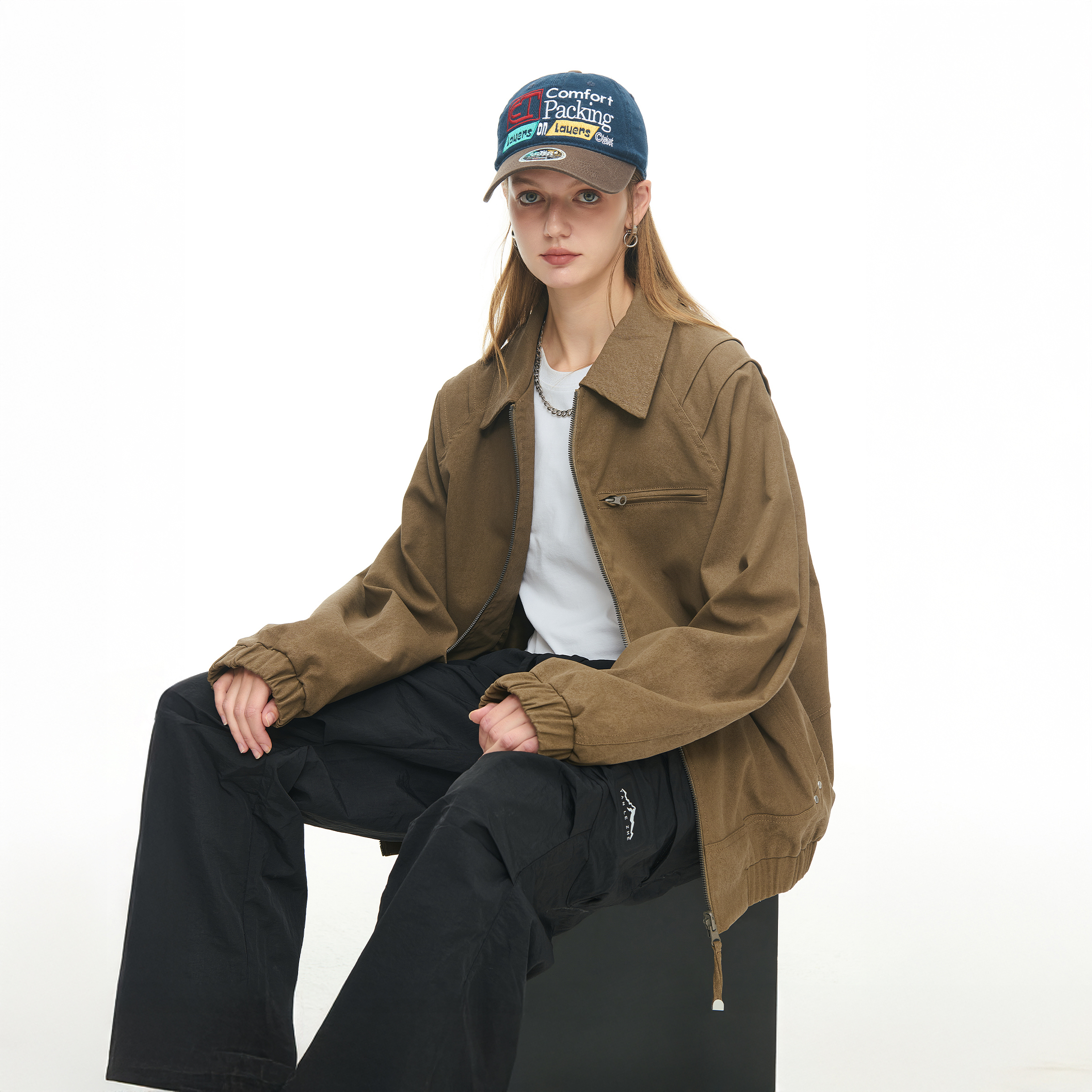 新品 短外套女秋季 宽松潮牌设计感情侣皮夹克上衣 复古翻领工装 美式