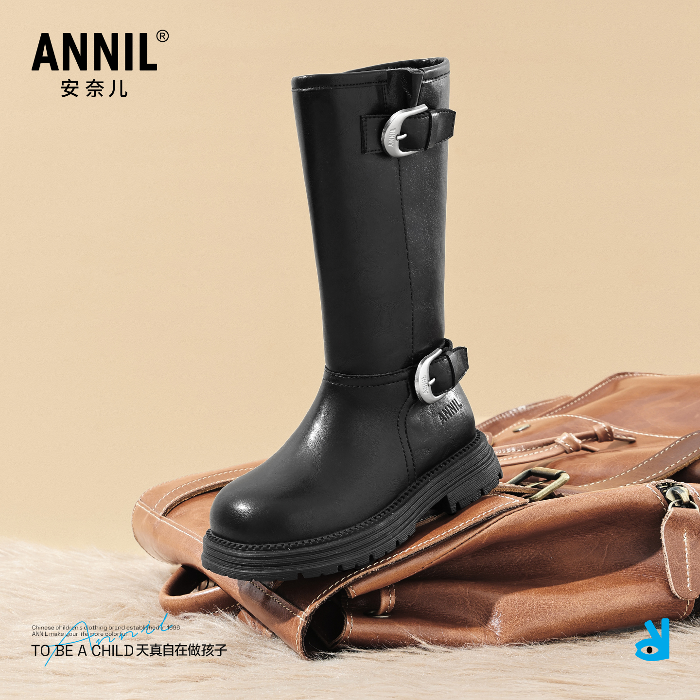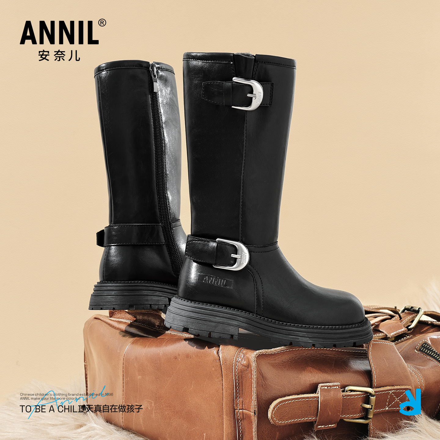 安奈儿女童靴子2025新款 儿童长筒靴女宝宝长靴高筒加绒皮靴 秋冬季