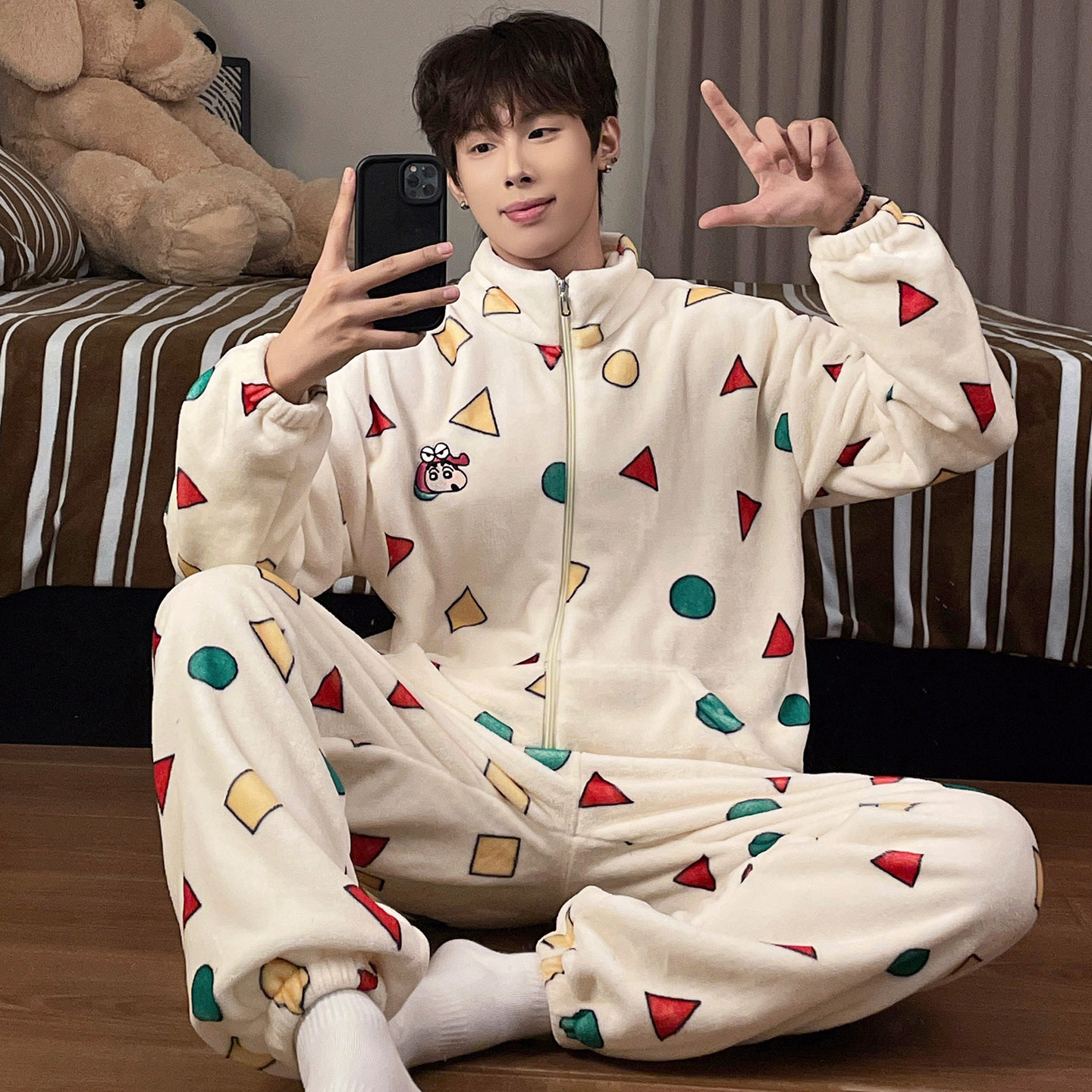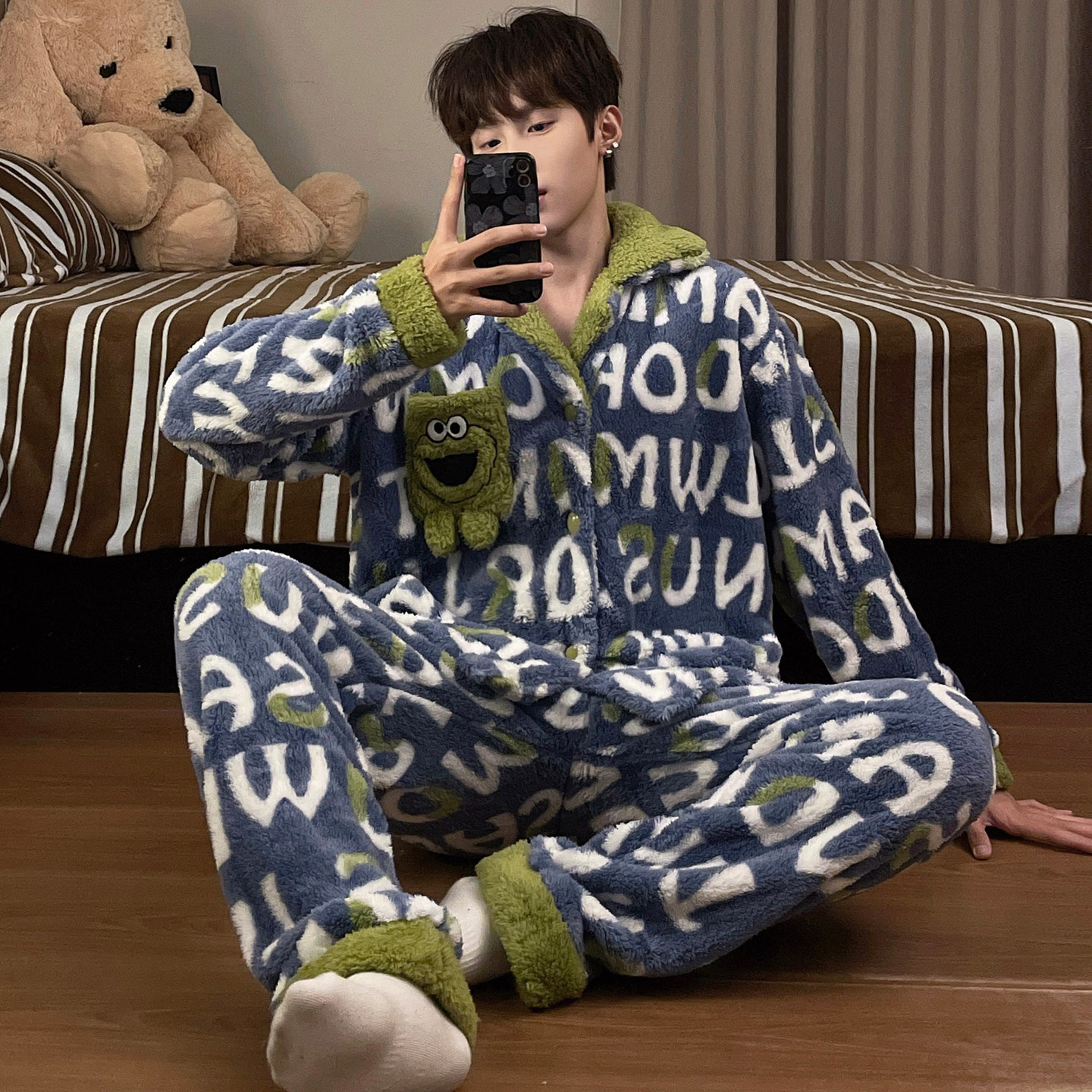加大码 冬天男款 家居服 加厚加绒青少年腊肠狗套装 珊瑚绒睡衣男冬季