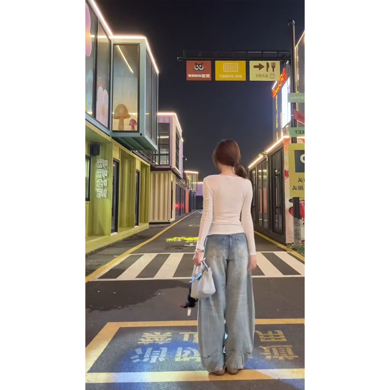 美式 辣妹修身 U领纽扣长袖 打底衫 显瘦上衣服 T恤女春秋内搭短款 时尚