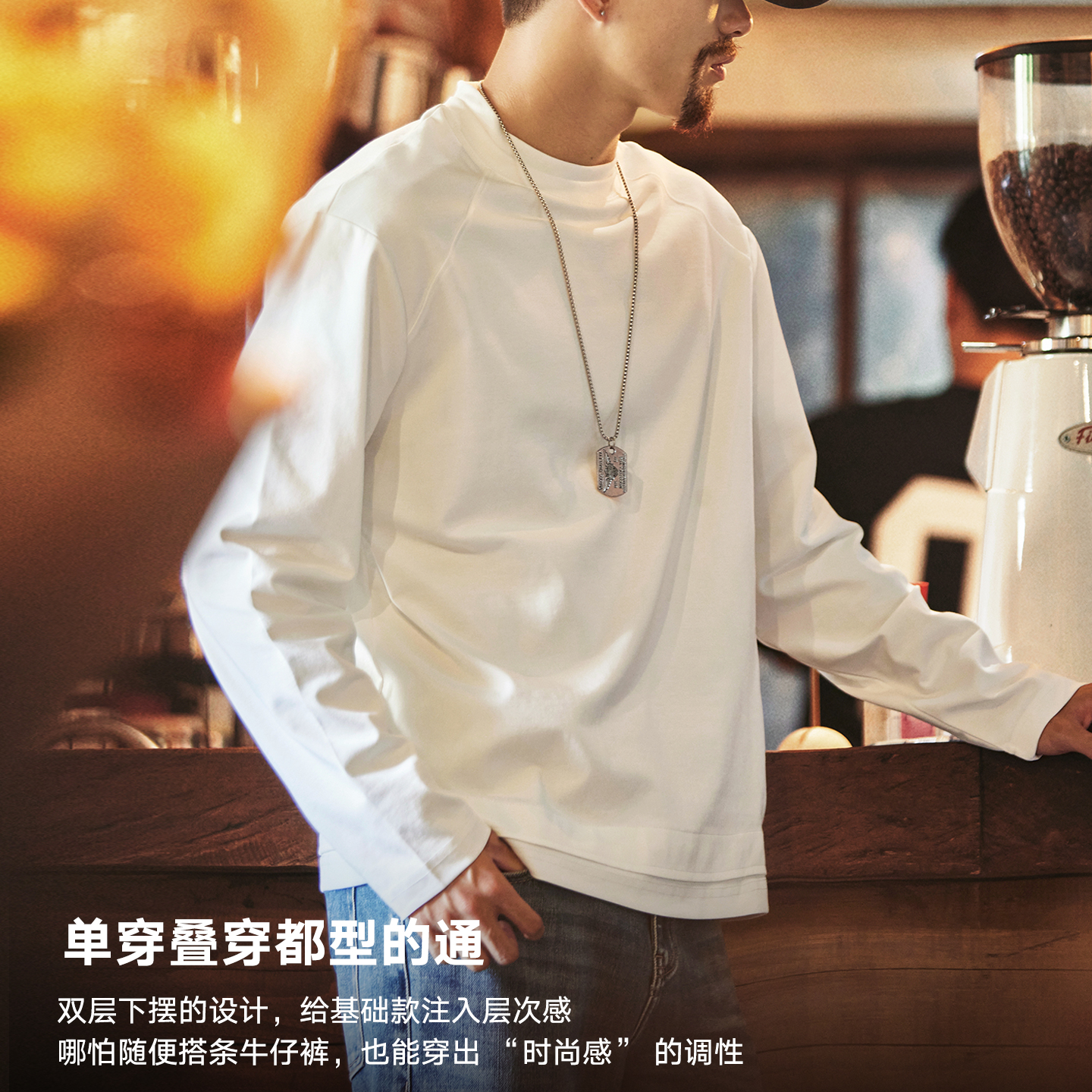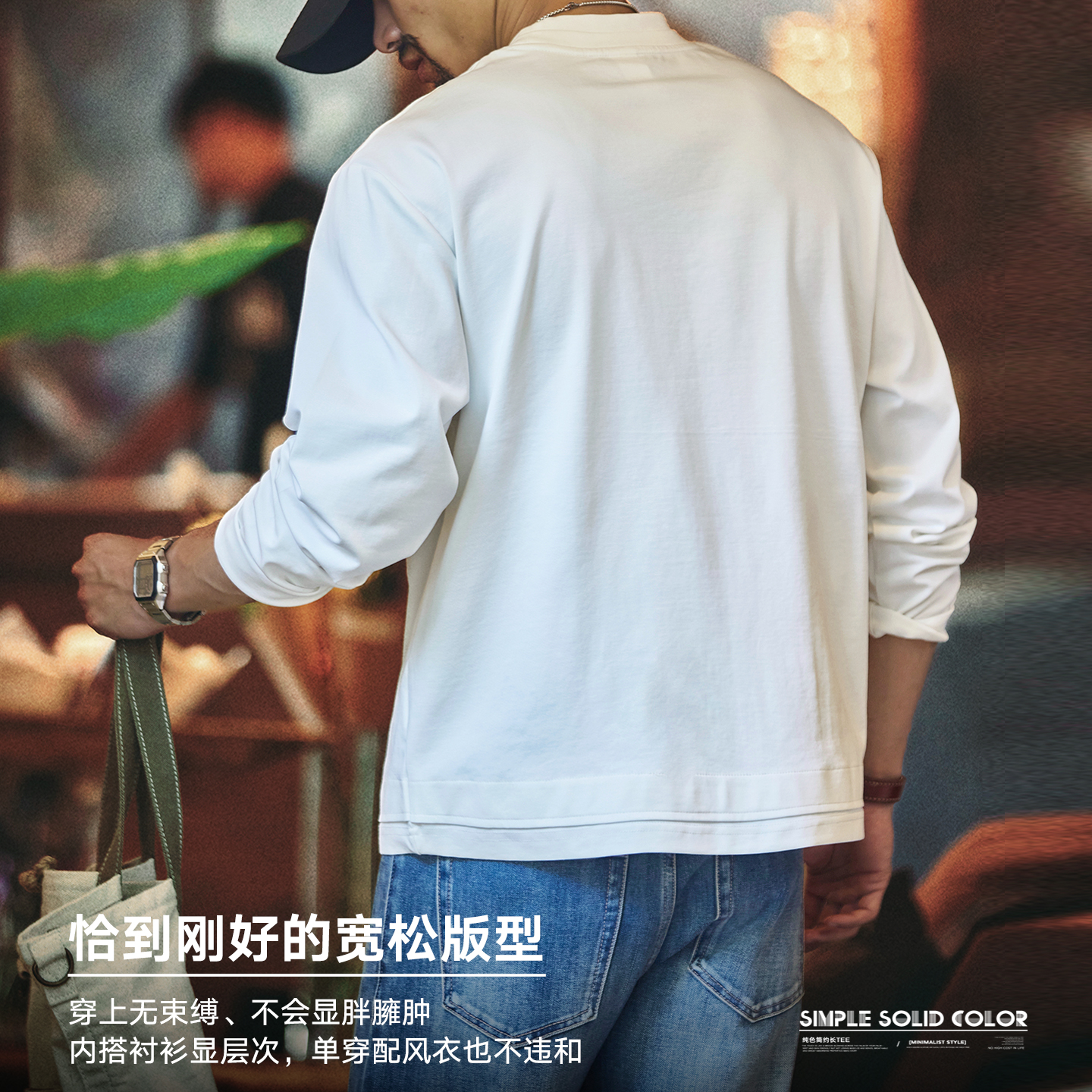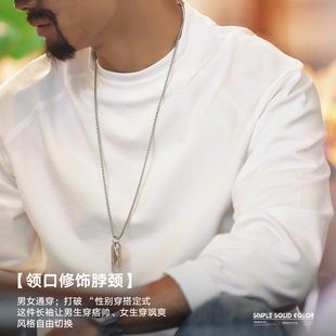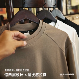 宇透重磅纯棉白色长袖 上衣 T恤男春秋休闲百搭纯色宽松圆领打底衫